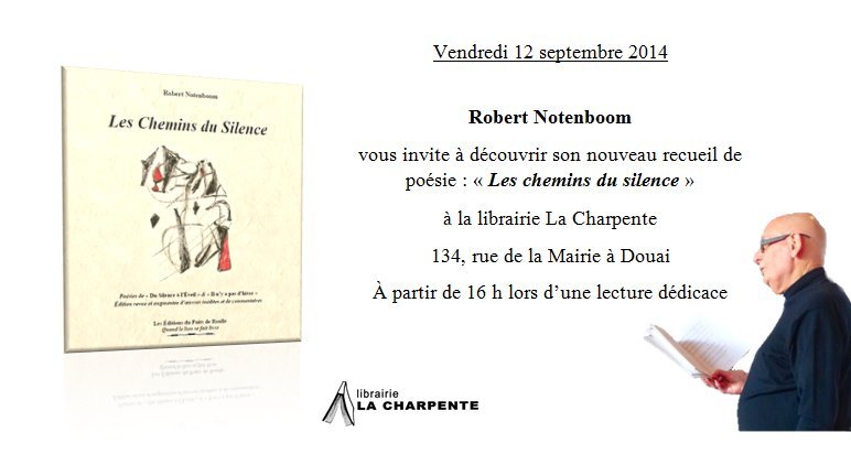 Notre ami et poète Robert Notenboom présentait son dernier recueil publié aux Editions du Puits de Roulle « Les Chemins du Silence » samedi dernier à la nouvelle librairie de Douai, La Charpente.