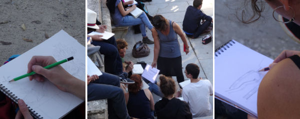 Au passage, nous avons pu vérifier que l’eau avait bien baissé depuis les gros orages. Les berges dans le jardin avaient repris leur aspect normal. Toute une classe de dessin s’était installée et les croquis prenaient forme un peu partout, sous le regard attentif de la prof.