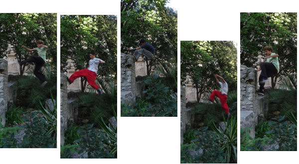 Vous connaissez peut-être le film d’Ariel Zeitoun, Yamakasi, produit par Luc Besson ? Nous vous en avions parlé sur le blog il y a six ans (ça file). Hier, en allant se promener avec Enzo pour profiter du ciel bleu, nous sommes tombés au jardin de la Fontaine sur des Yamakasi juniors. Décidément, après les pros du vélo trial, il y a toujours du spectacle dans ce parc.