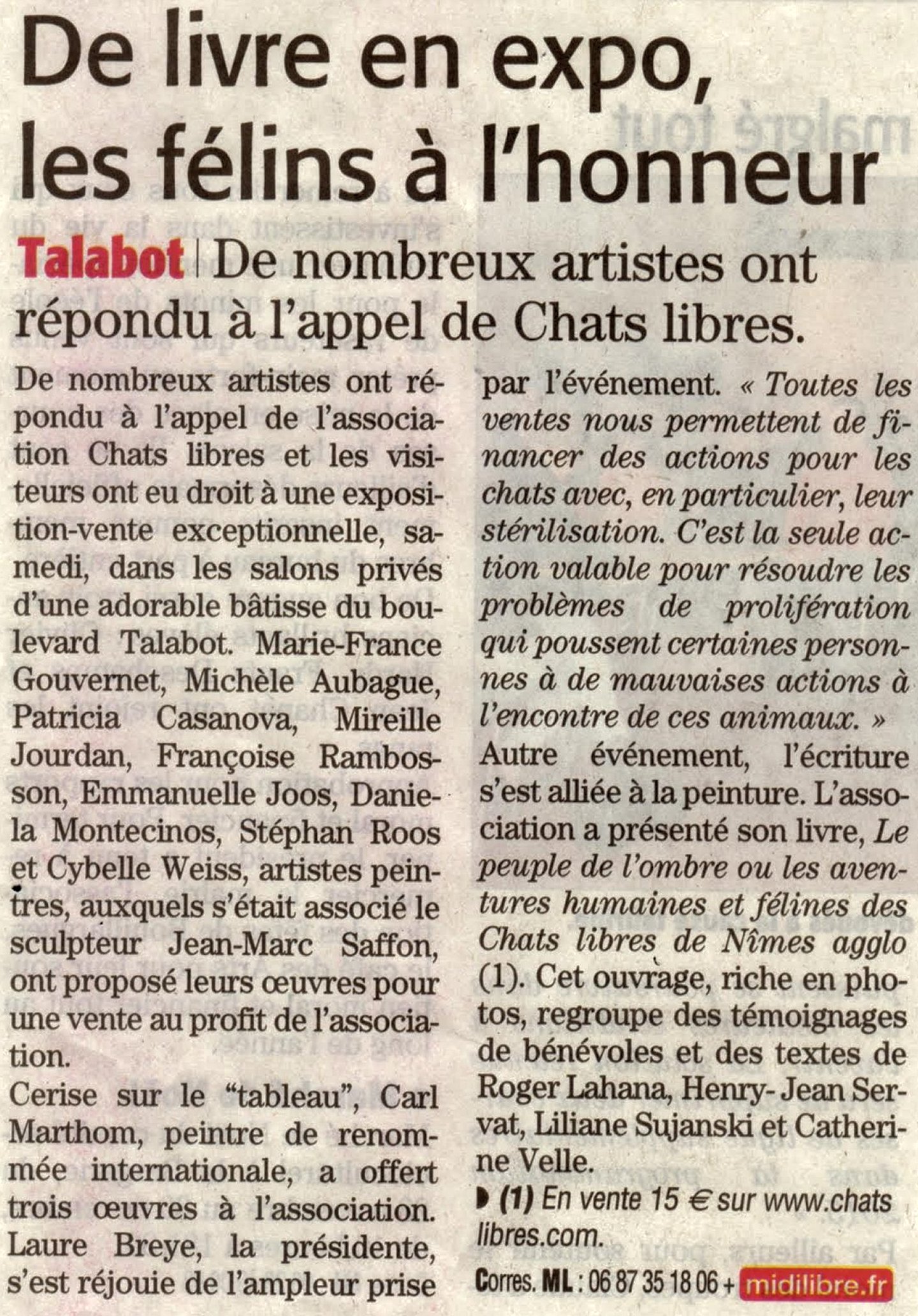 Un grand merci à monsieur René Genti, correspondant au Midi Libre, qui signe un très bel article sur l’exposition de l’Association des Chats Libres de Nîmes et son Agglo et la présentation en avant première du livre « Le peuple de l’ombre – Les aventures humaines et félines des chats libres de Nîmes Agglo » (sortie officielle le 10 décembre 2014, journée internationale pour les droits des animaux – disponible sur www.chatslibres.com)