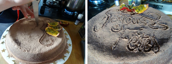 En deux temps et trois coups de cuillère à pot (ou l’inverse), elle nous a bricolé un fondant au chocolat et une tarte banane-chocolat. Quelques morceaux de fruits de la passion en déco, un « Joyeuses fêtes » écrit au couteau et hop ! Il n’y avait plus qu’à consommer.