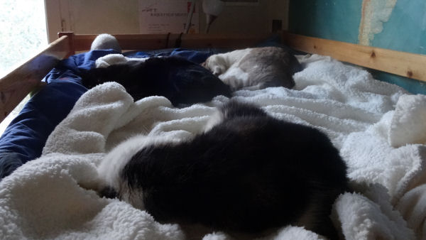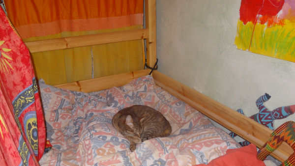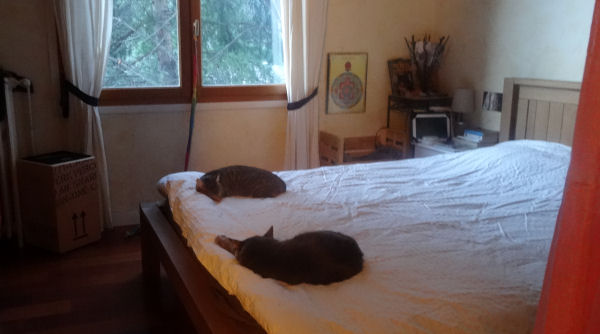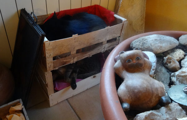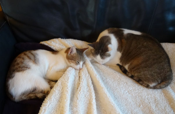 Hier, nos plus jeunes pensionnaires, Capucin et sa sœur Grigri, sont partis chez leur nouvelle famille, des personnes adorables qui vont leur offrir la plus belle des vies possible. Nos autres chats ont décidé de faire face à leur départ et de célébrer le bonheur qui les attend en se prélassant comme jamais (ou plutôt, comme tout le temps).
