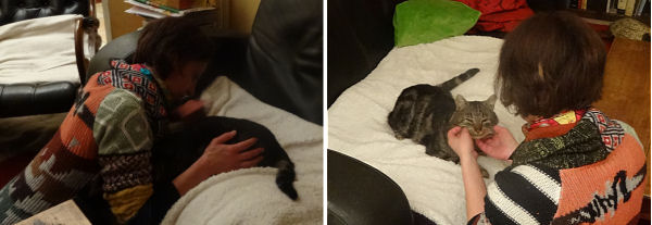 Nous avons récupéré Harry chez la véto où nous l’avions conduit hier après-midi, alors que nous récupérions Padmé (qui va très bien). Harry est actuellement un chat libre. Même s’il est assez souvent chez nous, surtout avec l’arrivée du froid, il vit de façon indépendante, très souvent dehors. Il n’est pas vraiment craintif, plutôt prudent. Avec un peu de douceur, il se laisse approcher et même prendre dans les bras ou accepter un câlin.