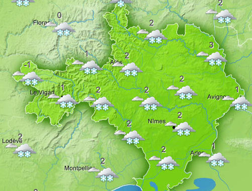 En ce qui concerne Nîmes, ça devrait aller sans problème ce matin, les chutes de neige arrivant par l’Ouest. Il faisait même plutôt beau vers 6 h, mais un couvercle nuageux a ensuite graduellement empli le ciel. Quelques flocons ont été signalé ailleurs dans la région. Ça devrait nous tomber dessus à partir de la mi-journée et c’est prévu pour durer jusqu’au soir.