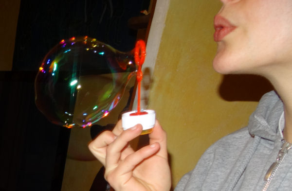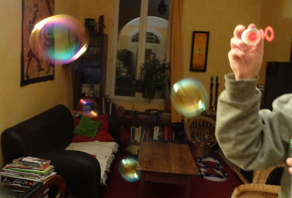 Il n’y a pas que le champagne pour s’égayer avec des bulles. Il y a aussi celles de savon, comme quand on était petit. Justement, Anti a acheté des nécessaires à faire des bulles avant-hier. Et le truc magique, c’est que, quel que soit l’âge qu’on peut avoir, on redevient instantanément enfant dès qu’on fait ou qu’on regarde des bulles de savon.