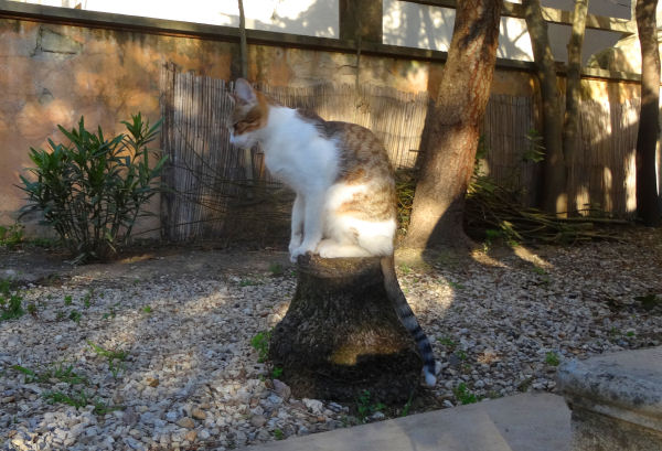 Joli Coeur a jeté son dévolu sur le tronc d’un de nos palmiers défunts. Vue imprenable, proche tous commerces (il suffit de remonter l’escalier pour atteindre, entre autres, la cuisine), ça fait réfléchir.