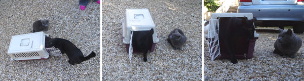 Lulu a, lui, visité avec beaucoup d’intérêt une superbe caisse de transport moderne et aérée, celle que nous utilisons depuis des années pour conduire nos minous (et d’autres) chez le véto, mais ça n’a pas l’air de les traumatiser. Padmé a suivi l’inspection de près, il se serait bien laissé tenter. Sauf qu’Anti est partie avec la caisse et des pièges pour aller trapper des chats en danger dans un quartier de Nîmes.