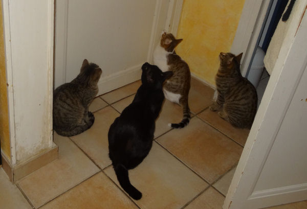 Trop mignon les minous qui attendent derrière la porte d’où filtrent les odeurs de poulet! Insoutenable. En fait, les regards sont rivés sur la poignée d la porte!