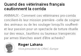 huff vetos uneHier, j’ai eu le plaisir de voir accepter en un temps record un nouvel article dans le Huffington Post. Il traite du cas incroyable de ces vétérinaires – plutôt rares, heureusement – qui soutiennent la corrida malgré leur mission première, celle de soulager les souffrances animales.