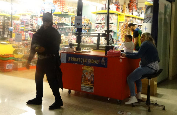 Nous avons dû traverser une faille dans le continuum spatio-temporel et basculer dans un univers parallèle : nous nous sommes retrouvés dans une galerie marchande et là, qui avons-nous croisé ? Batman en personne. Dans quel nouveau monde venions-nous d’arriver ?
