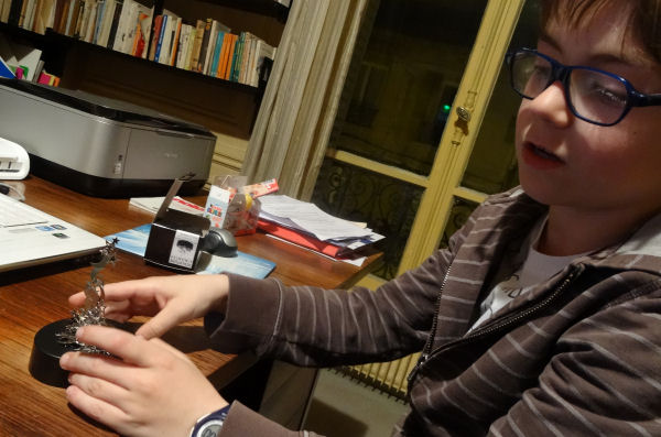 Dans l’après-midi, il est reparti faire un tour au palais de la Découverte avec ma maman. Là, il a suivi d’autres présentations mais avant de repartir, il a fait un petit passage par la boutique et sa mammy lui a offert un petit jeu composé d’un aimant et de petites figurines en métal – étoiles et lunes. En les posant sur l’aimant, elles tiennent les unes aux autres et forment parfois des amoncellements qui défient les lois de la pesanteur.