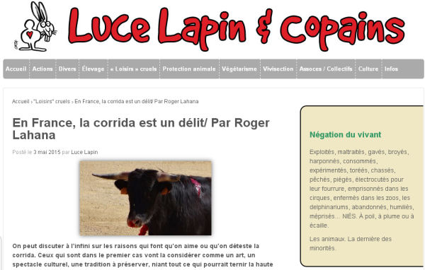J’ai le grand plaisir de vous annoncer la mise en ligne d’un nouvel article sur le site de Luce Lapin, Luce Lapin et Copains. Vous pouvez le lire dans sa version originale ici : En France, la corrida est un délit. En voici les premières lignes.