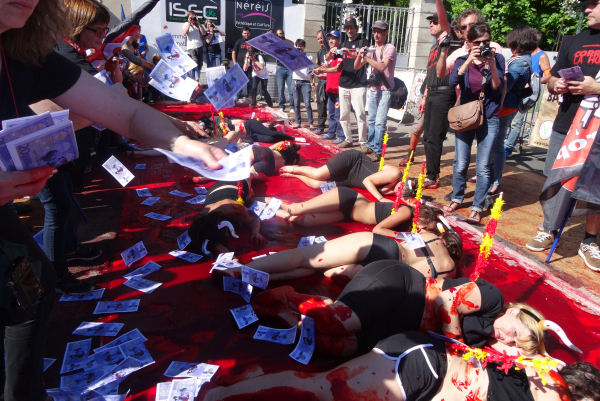 Au moment du début de la corrida à 200 mètres de là, une vingtaine de personnes (presque uniquement des femmes) se sont allongées dans le sang, affublées de cornes de taureau et de banderilles pendant que la sono diffusait la bande-son du film « Derrière les murs » de Jérôme Lescure. Puis, le silence et un enregistrement de cris d’agonie d’un veau massacré à Alès en 2013 sous les applaudissements du public des sinistres arènes.