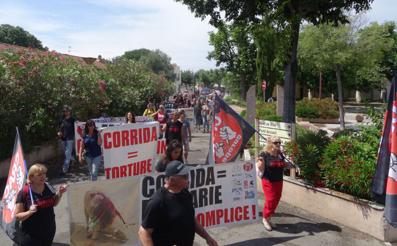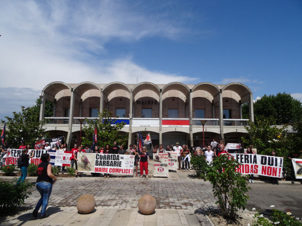 Depuis, 70 victimes parfaitement identifiées attendent toujours le procès de 30 agresseurs parfaitement identifiés. Cela fait presque quatre ans et toujours pas le moindre début de signe d’ombre de date de comparution. Face à ce déni de justice, les anticorrida reviennent inlassablement dans la ville de la honte à chaque fois que son maire, toujours le même, décide de programmer à nouveau une séance de torture. Celle du 14 juin 2015 a été annulée sous notre pression, ainsi que les deux prévues le 13 à Manduel où aucune action n’avait été annoncée. Nous avons décidé de venir quand même, puisque notre déclaration de manifester nous y autorisait.