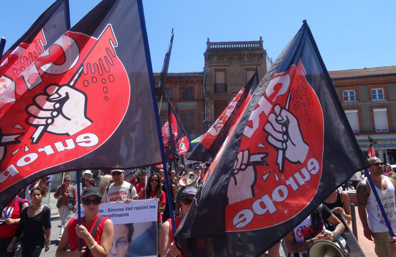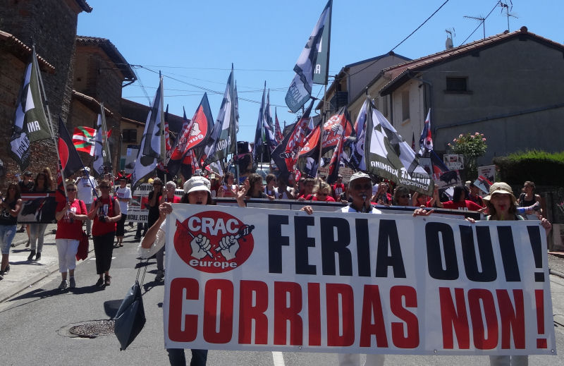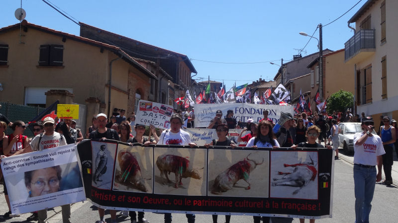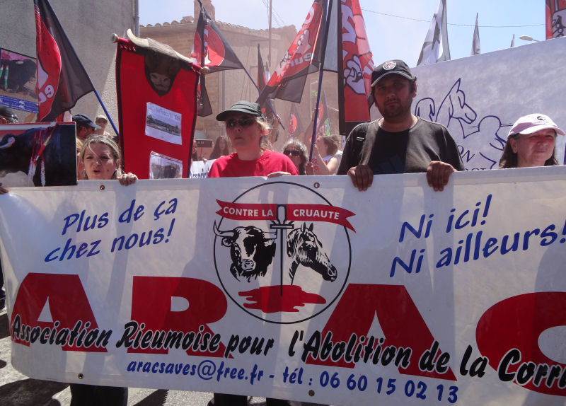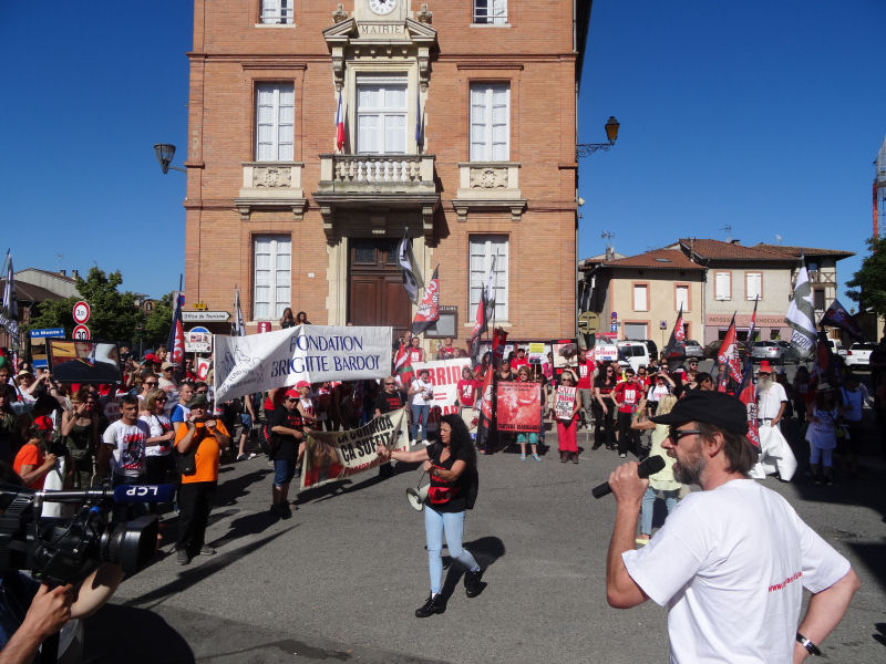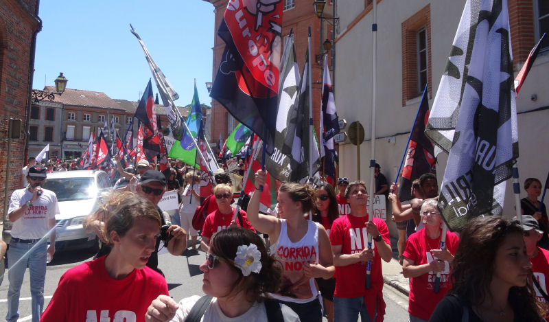 La plupart des habitants de Rieumes, comme la plupart des Français, ne veulent plus des corridas chez eux. C’est déjà le cas partout ailleurs en Haute-Garonne, un département qui a rejeté depuis longtemps ces pratiques barbares… sauf à Rieumes. La corrida, dans cette commune autrement paisible et accueillante, ne doit sa présence qu’à un groupuscule local soutenu, en dépit de toute logique, par la municipalité. C’est ce que nous ont dit et répété de nombreux Rieumois au passage de notre cortège – beaucoup l’ont d’ailleurs spontanément rejoint pour manifester avec nous.