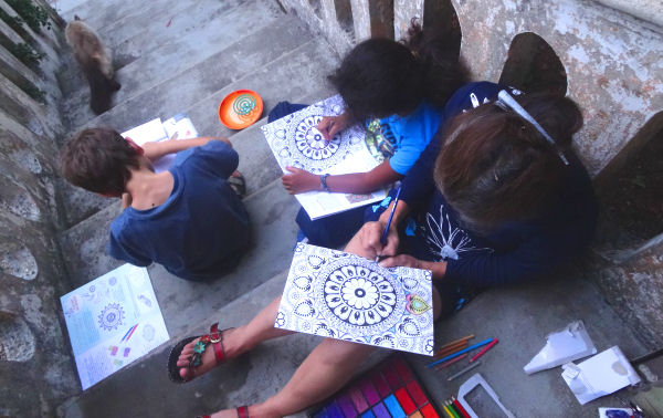 Au crépuscule, l’idée est venue de faire du coloriage. Anti a sorti plein de trésors de ses coffres à trésors. Les couleurs ont fusé, les rires aussi, en même temps que cette concentration si particulière que seuls les enfants sont capables de montrer.