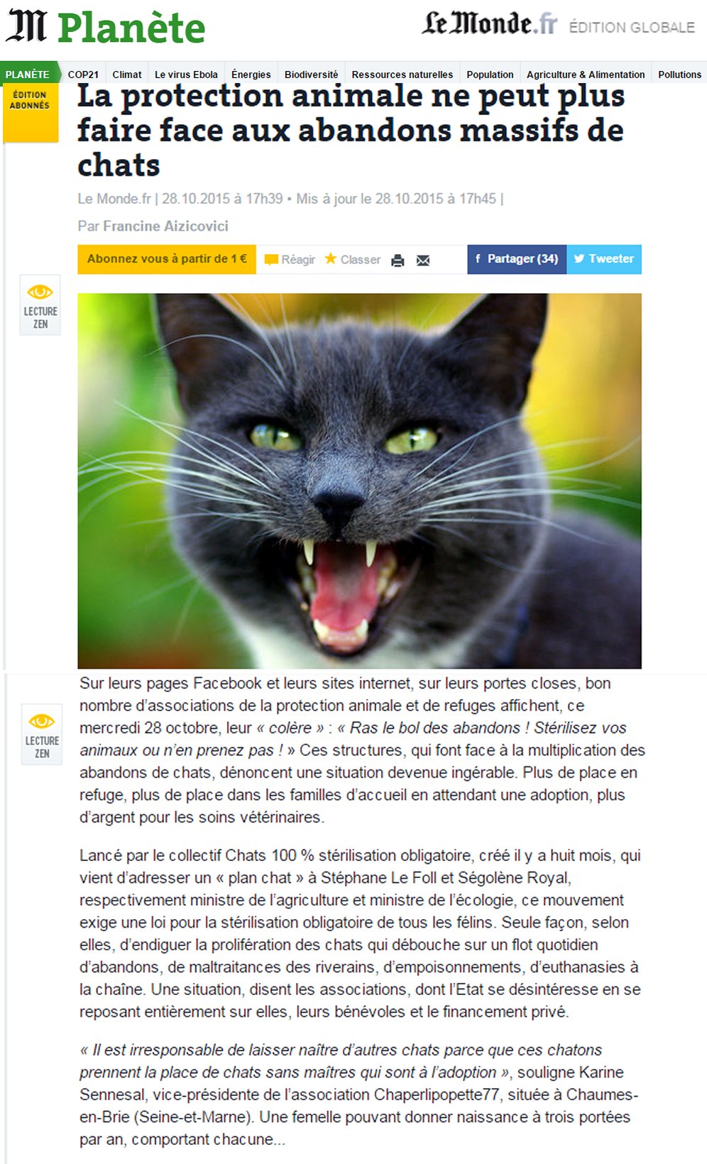 Lancé par le collectif Chats 100 % stérilisation obligatoire, créé il y a huit mois, qui vient d’adresser un « plan chat » à Stéphane Le Foll et Ségolène Royal, respectivement ministre de l’agriculture et ministre de l’écologie, ce mouvement exige une loi pour la stérilisation obligatoire de tous les félins. Seule façon, selon elles, d’endiguer la prolifération des chats qui débouche sur un flot quotidien d’abandons, de maltraitances des riverains, d’empoisonnements, d’euthanasies à la chaîne. Une situation, disent les associations, dont l’Etat se désintéresse en se reposant entièrement sur elles, leurs bénévoles et le financement privé.
