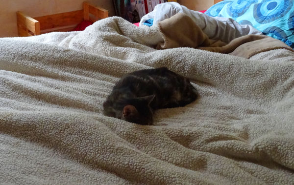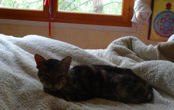 Notre plus récent pensionnaire, Timi, prend ses aises. Cela fait déjà quelques temps qu’il sort et rentre quand il le veut. Depuis deux nuits, il a décidé de dormir avec nous, contre mes jambes. Et hier, dans la matinée, il est revenu faire une sieste sur le lit.