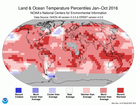 L’année 2016 s’annonce toujours pour être la plus chaude jamais mesurée au niveau planétaire. C’est la troisième année consécutive dans ce cas. A de très rares exceptions près, ce record concerne localement quasiment toutes les régions du monde.