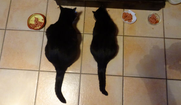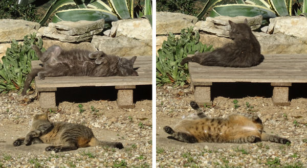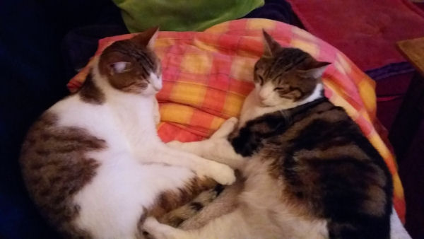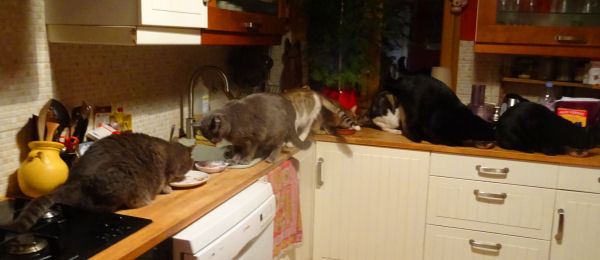 Hier soir, pour me coucher, c’était encore plus encombré. Anti était endormie et quatre ou cinq chats occupaient tout le reste de la place. Il a fallu que je me glisse progressivement au milieu des minous, qui ne bougeaient que le strict minimum pour laisser passer mes jambes et mon corps sous la couette. Mais ils ne m’en ont pas voulu, hein, ils ronronnaient 🙂