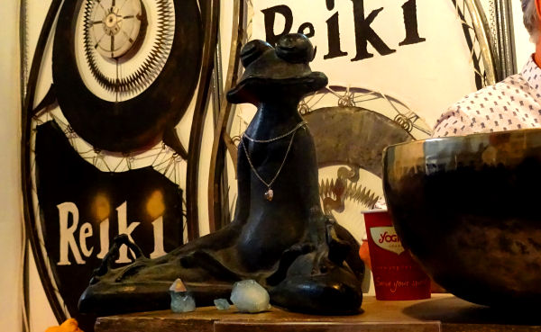 Comme la magie est toujours à portée de main, surtout dans un salon comme celui-là, nous avons également croisé, près d’un bol chantant, sur un stand consacré au reiki, une très amusante grenouille méditante, qui rappelle que le mot spirituel veut aussi dire drôle.