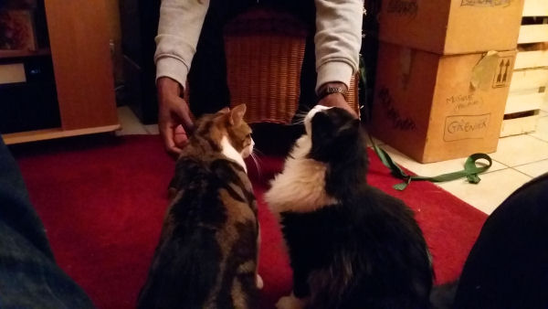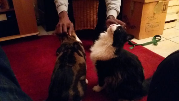 Dimanche, Mouayadi est venu nous rendre visite en fin de journée. A un moment, Maley s’est approché de lui pour demander une caresse. Comme très souvent, Will s’est alors aussi avancé pour en prendre sa part – ces deux-là sont vraiment inséparables, surtout quand il s’agit de câlins. Mouayadi a assuré grave : deux chats ? deux mains. Admirez la synchro :