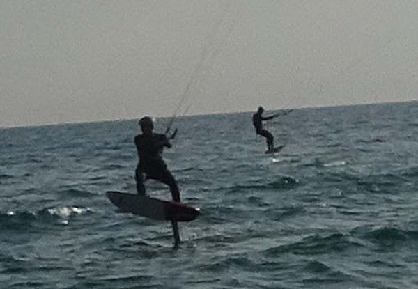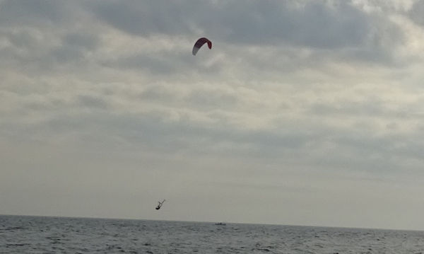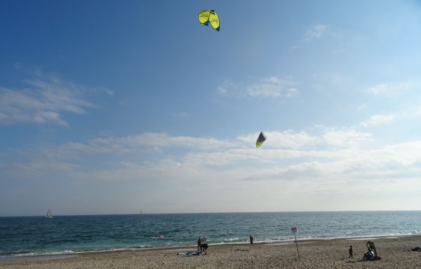 Nous sommes restés sur la plage une bonne demi-heure. C’était très agréable. Des kite-surfers assuraient le spectacle sans un bruit, comme dans un rêve. Une ambiance vraiment parfaite.