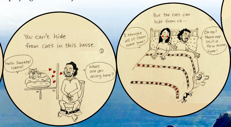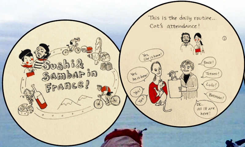 Quelle surprise hallucinante ! On avait les yeux écarquillés et on n’arrêtait pas de lire et relire les mots de Yuka. Et ses dessins, magnifiques de drôlerie ! En effet, ça fait tout drôle de se retrouver comme ça sur deux pages avec nos chats dans un quotidien très lu en Inde.
