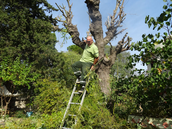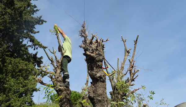 Notre acacia a enfin eu la fin de sa coupe de saison. Ses branches de l’année ont été ratiboisées par notre ami Stéphane dont je rappelle qu’il travaille à l’Office National des Forêts, donc les arbres, il connait bien. Et sans aucun doute, ce qu’il fait demande une parfaite maîtrise, de l’experience, ainsi qu’un sens certain de l’équilibre. Petit reportage photo :