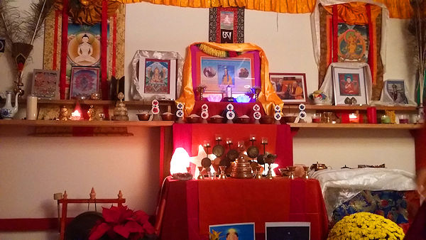 Un grand autel richement orné de tormas, bols de riz, bougies, tangkas, katas, bols chantants et autres instruments de musique rituelle… Des lung-ta qui traversent la pièce… Des tapis partout, avec des coussins de méditation posés de ci de là… Une chaire pour le lama lorsqu’il enseigne ou conduit des pratiques…