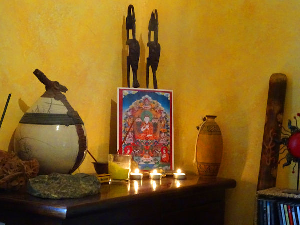 Sans rentrer trop dans les détails du rituel proprement dit, cinq symboles devaient être représentés, les cinq éléments qui sont au cœur de la tradition bön : la terre, l’eau, le feu, l’air et l’espace. Les différents objets posés sur la petite table de notre salon les montraient tous.
