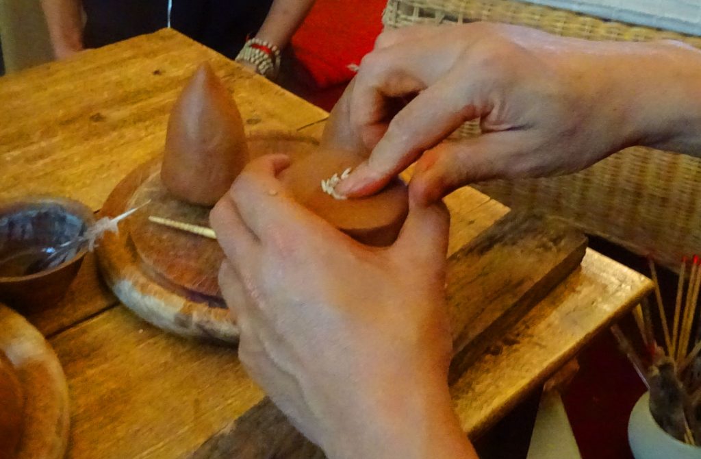 Pendant que Lama Samten récitait les textes du rituel, il façonnait neuf stupas en argile à l’aide d’un moule spécial. Pourquoi neuf ? Parce que je suis âgé de 63 ans, symbolisés par 6 et 3 figurines. Un stupa est – en vraie grandeur – un tumulus qui contient des reliques ou objets sacrés. Dans ceux modelés par Lama Samten ont été introduits quelques grains de riz.