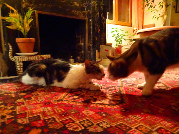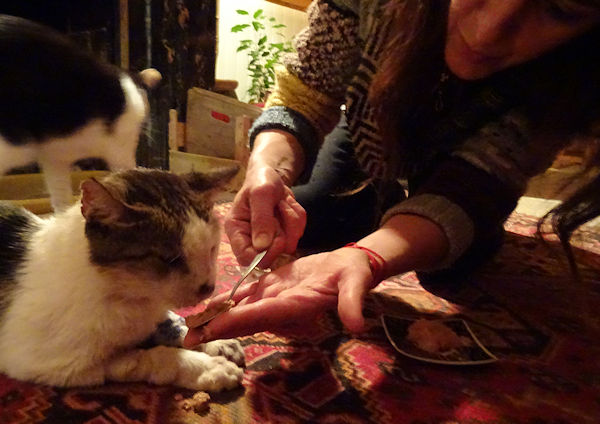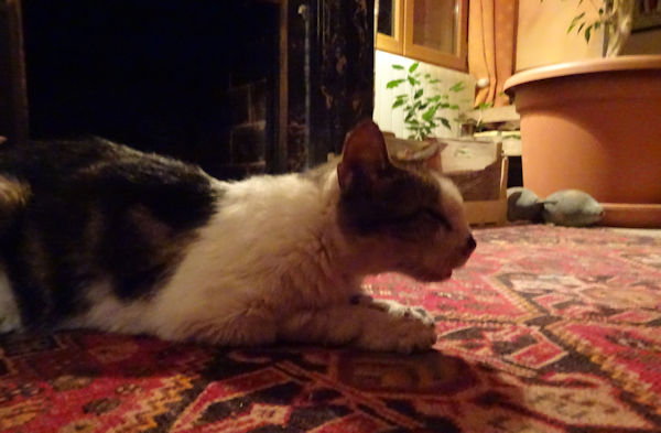 Charlot a décidé pour commencer de s’installer sur le petit tapis devant la cheminée. Il a mangé avec appétit ce qu’Anti lui proposait à la cuillère (une pâtée très protéinée qui permet de lui fournir un apport alimentaire suffisant avec une quantité très faible).