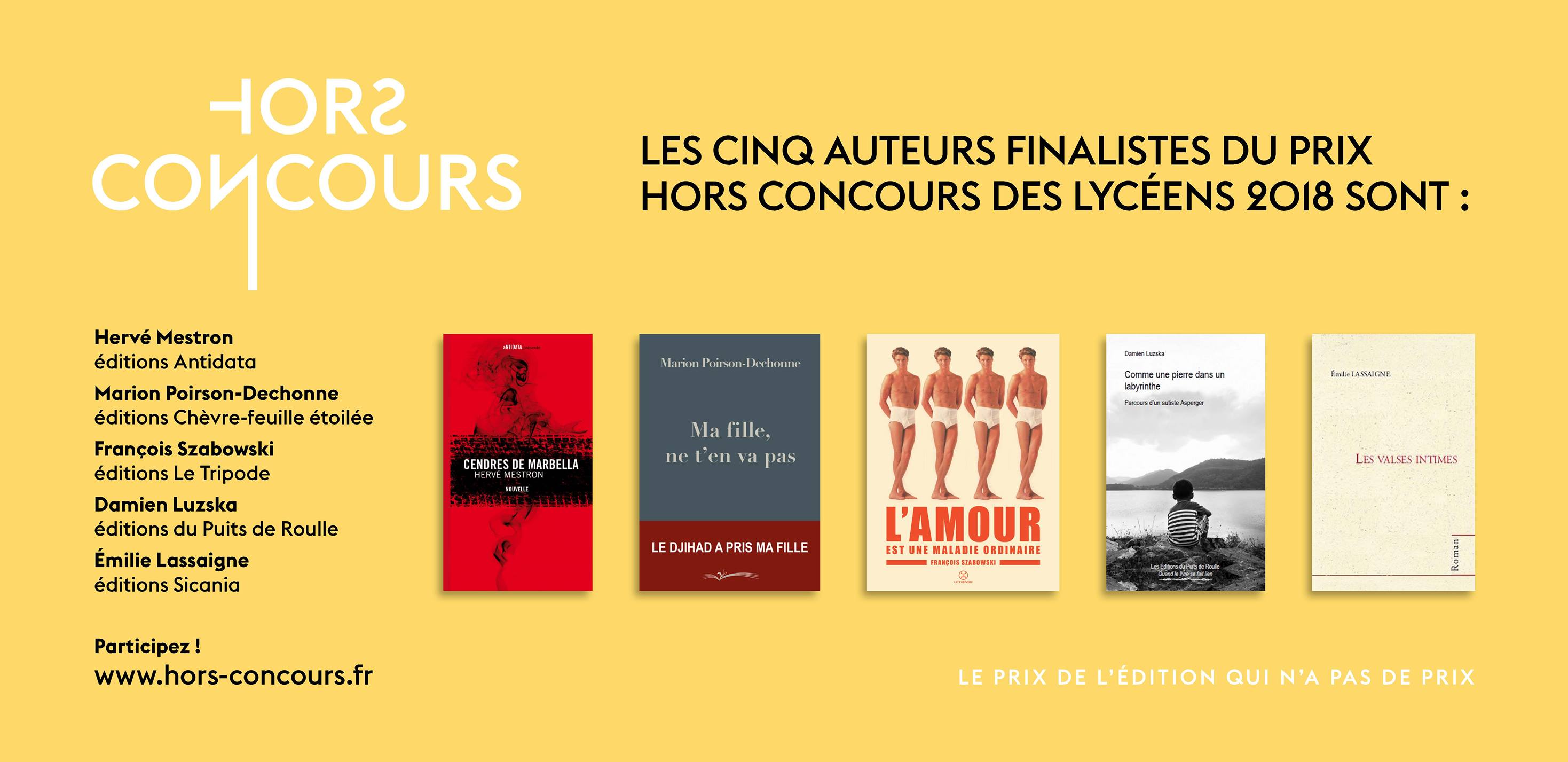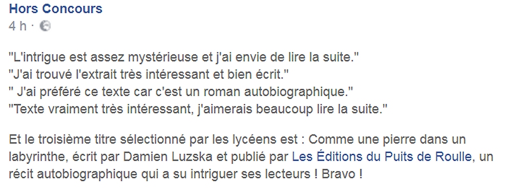 Oui ! Je suis sincèrement heureuse pour Damien et pour Les Editions du Puits de Roulle, et pour le Prix Hors Concours et pour les lycéens et professeurs qui ont participé au jury. Une bien belle chaîne autour du livre !