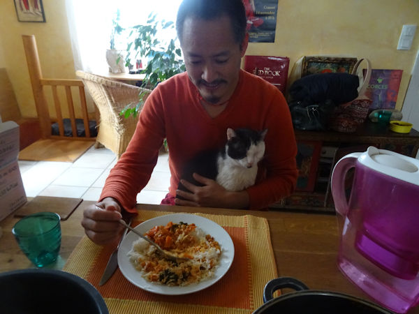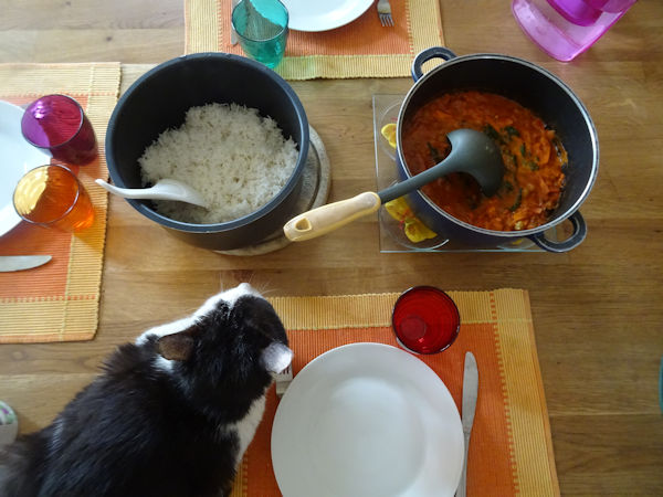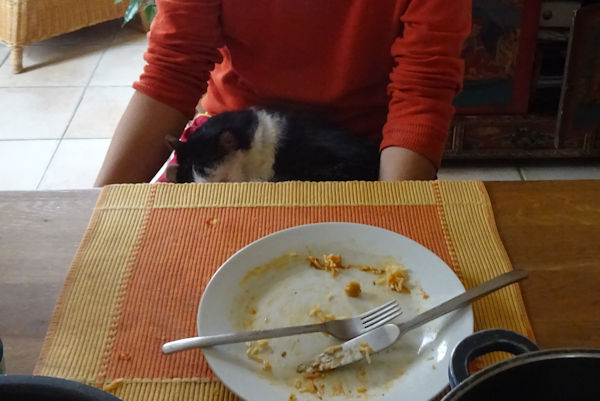 Habituellement, quand nous passons à table, Tanguy vient nous rejoindre. Sur la table. La plupart du temps, il se contente de boire un verre d’eau pendant que nous mangeons. Mais hier à midi, il a amélioré son mode opératoire.