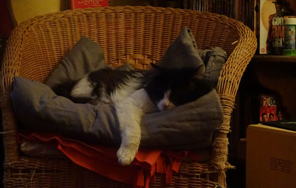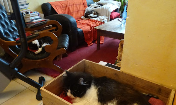 Jusqu’à il n’y a pas longtemps, Mimi passait parfois au niveau du séjour, mais de façon éphémère. La plupart du temps, il préférait rester dans les combles. A force, il a bien remarqué qu’on y était bien mieux : il fait bon y compris la nuit, il y a plein d’autres chats, les humains vont et viennent paisiblement et des odeurs alléchantes s’échappent à longueur de journée de la cuisine.