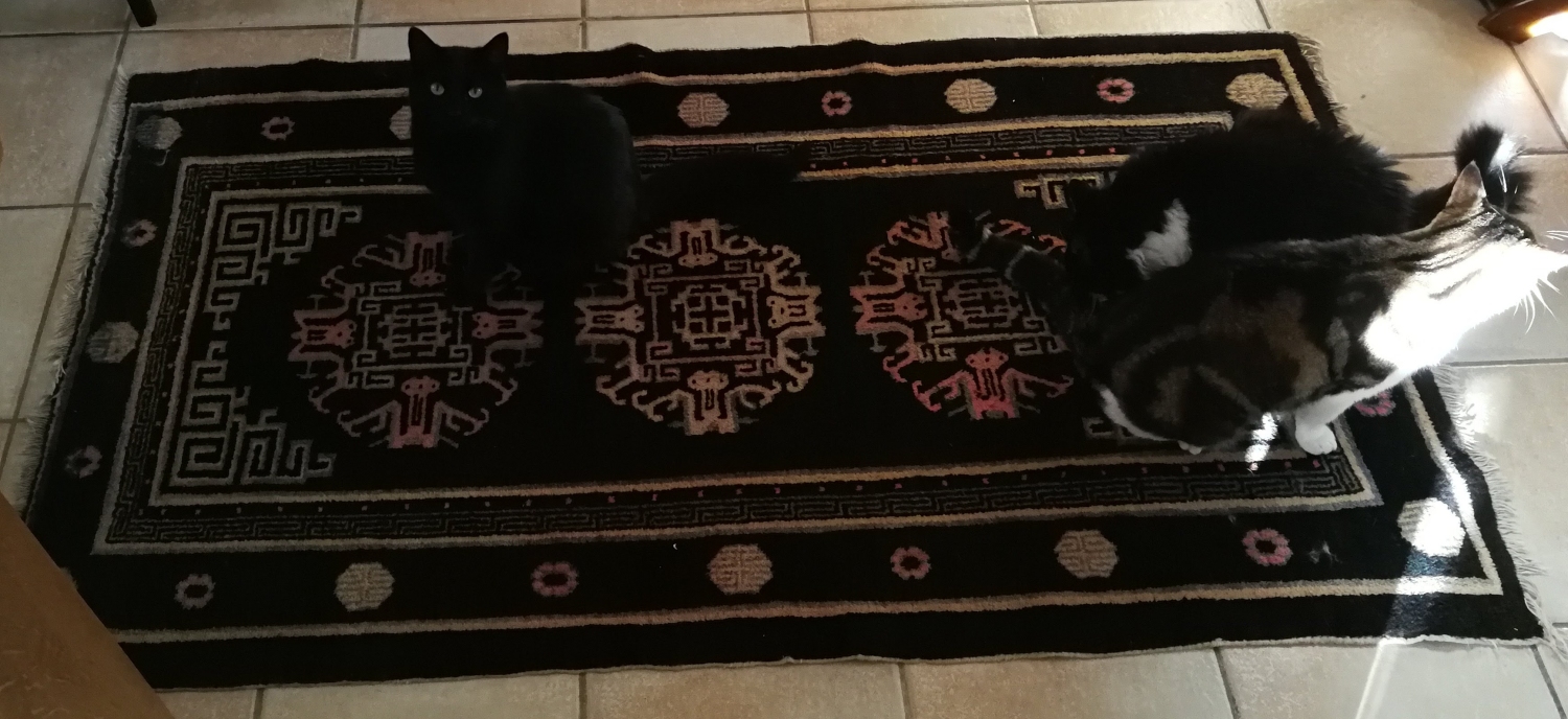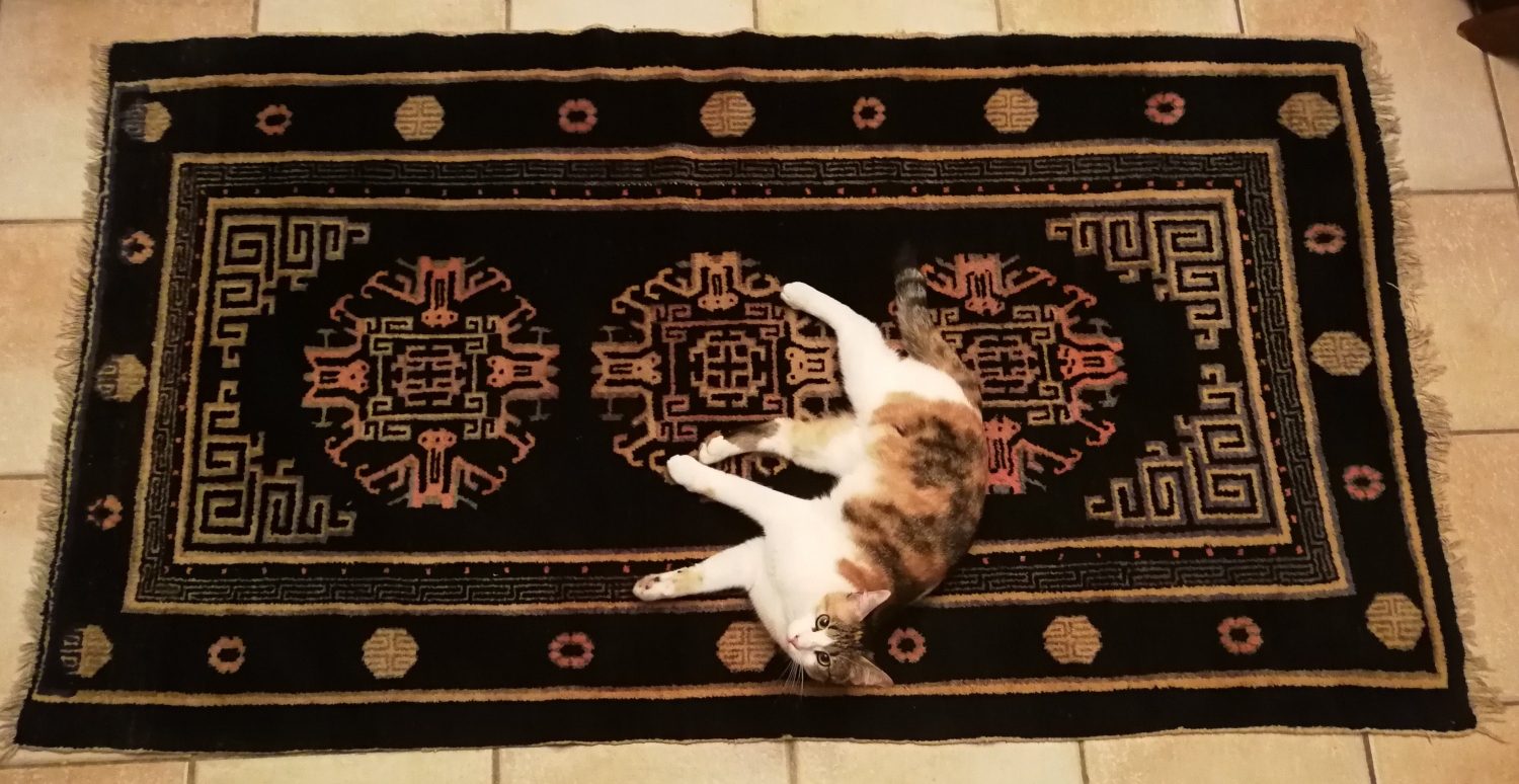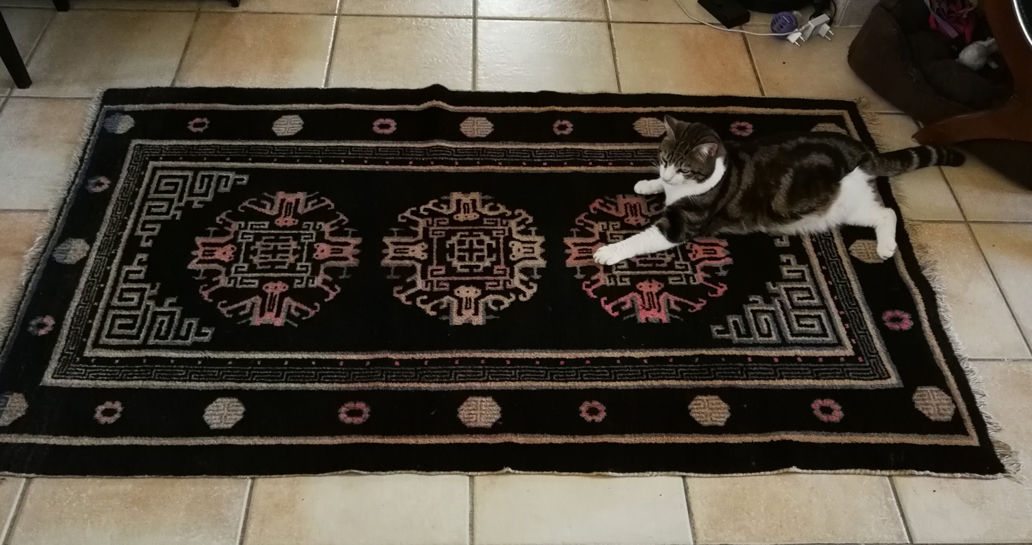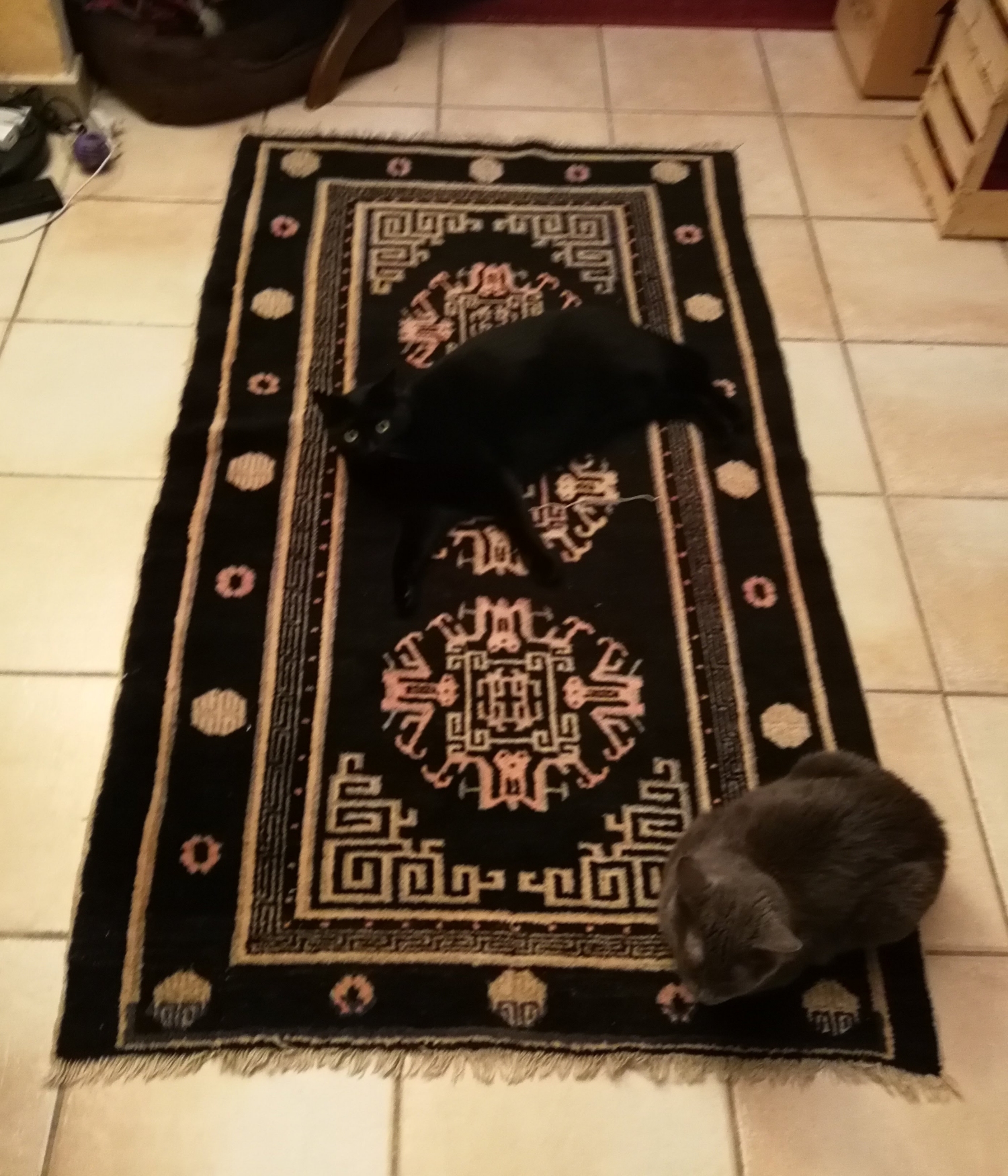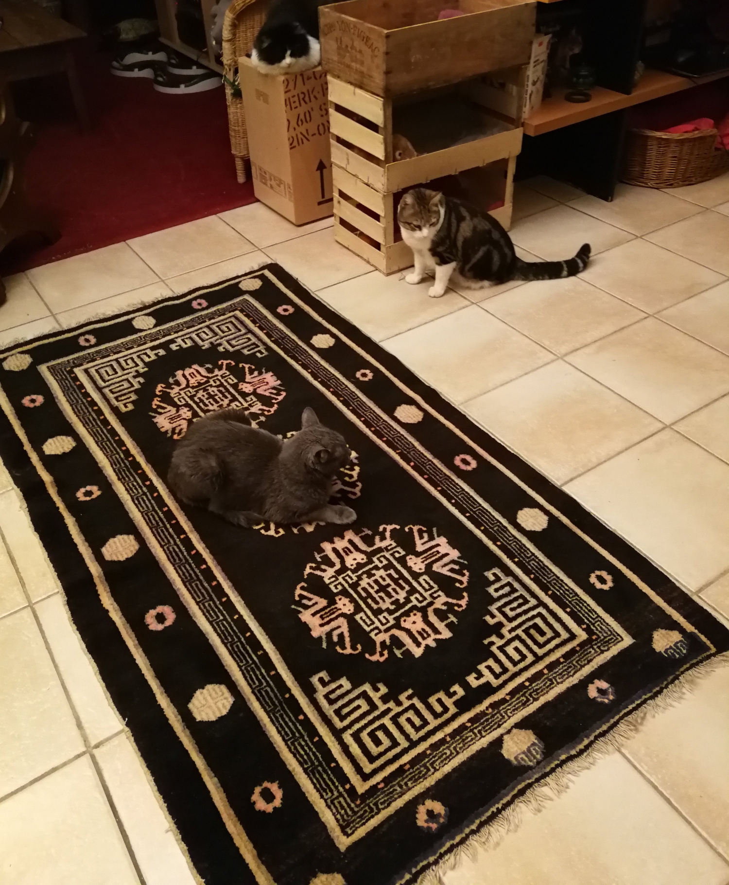 Voilà, comme Anna vous le disait, samedi dernier, j’ai acheté un tapis, un magnifique tapis, un bout de Tibet qui est devenu rapidement la totalité de l’espace de nos chats, un jardin qu’ils ne cessent d’explorer depuis… Ils sont vraiment adorables à le parcourir, à se prélasser dessus, à le faire « sien »…