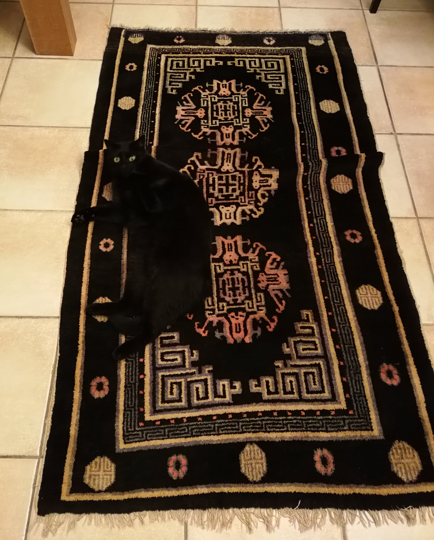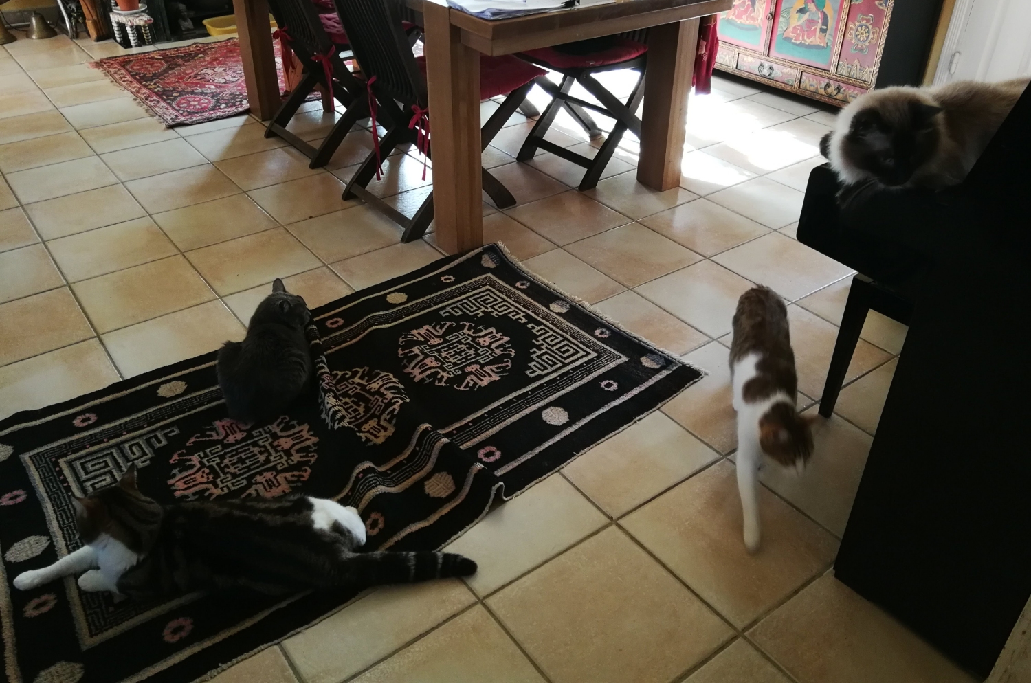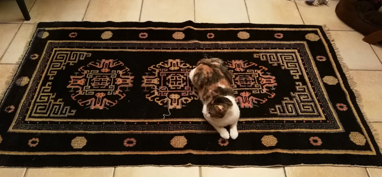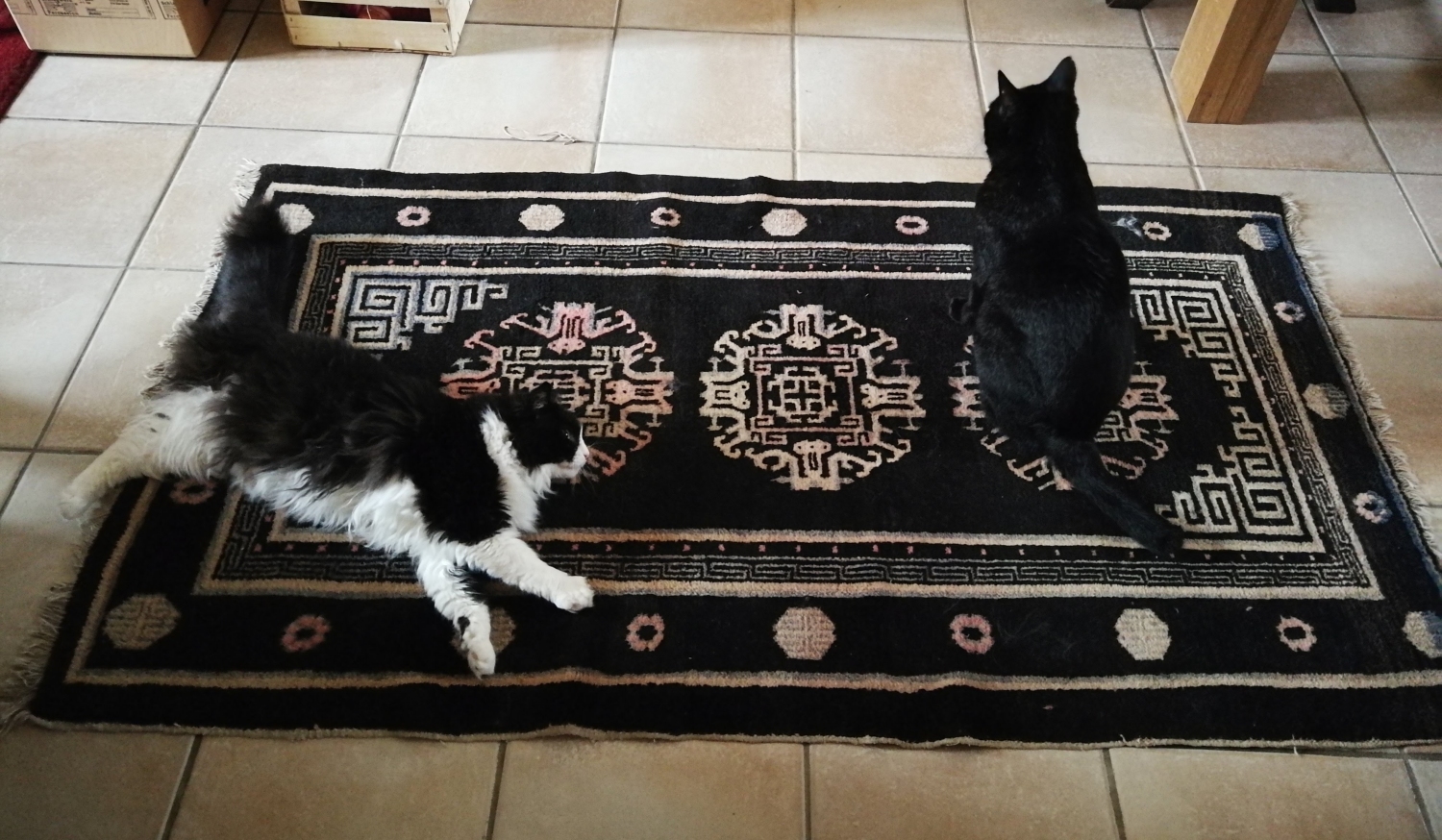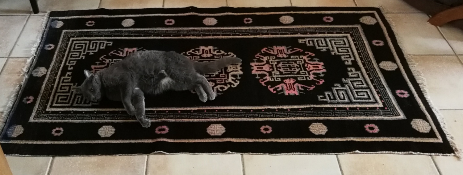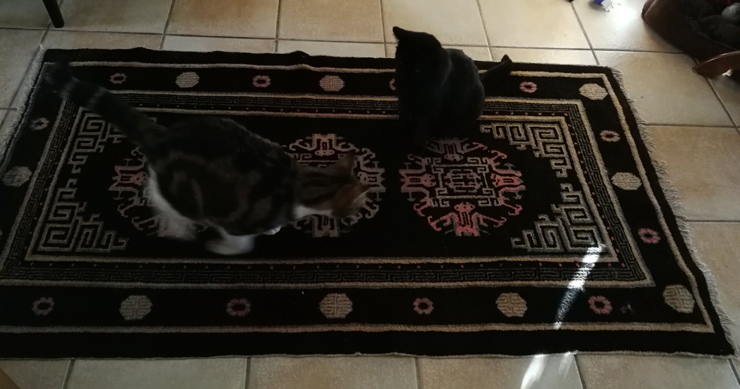Voilà, comme Anna vous le disait, samedi dernier, j’ai acheté un tapis, un magnifique tapis, un bout de Tibet qui est devenu rapidement la totalité de l’espace de nos chats, un jardin qu’ils ne cessent d’explorer depuis… Ils sont vraiment adorables à le parcourir, à se prélasser dessus, à le faire « sien »…