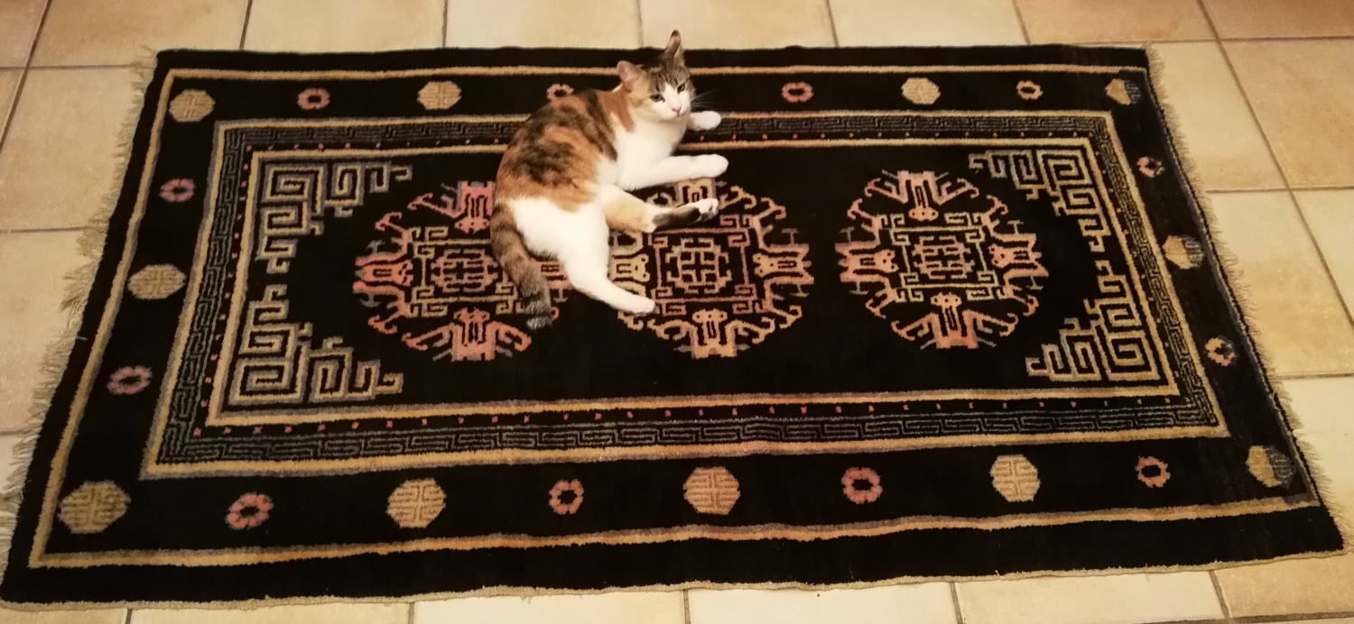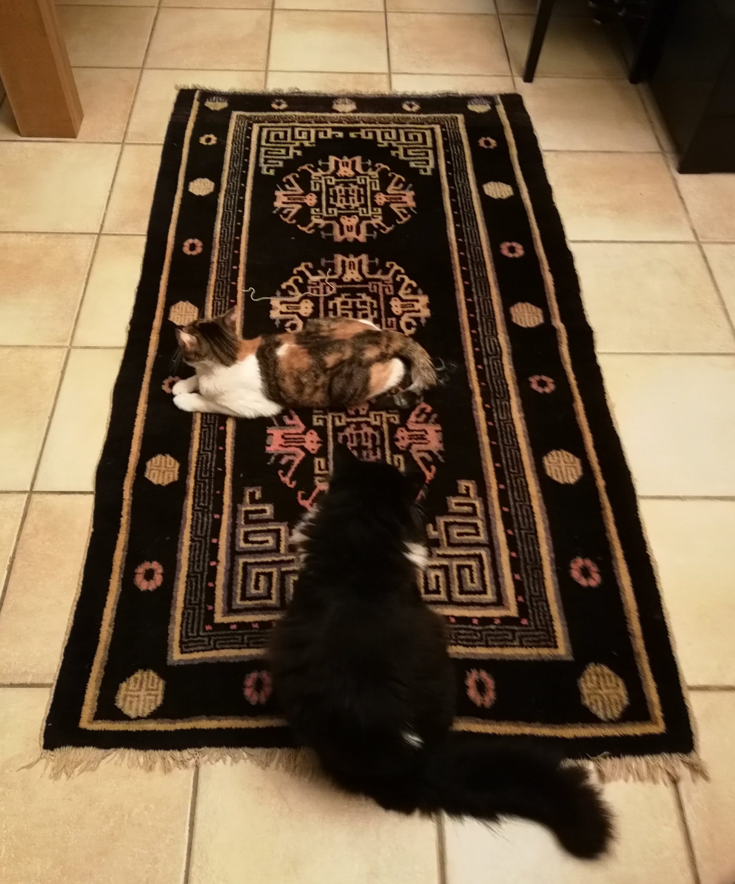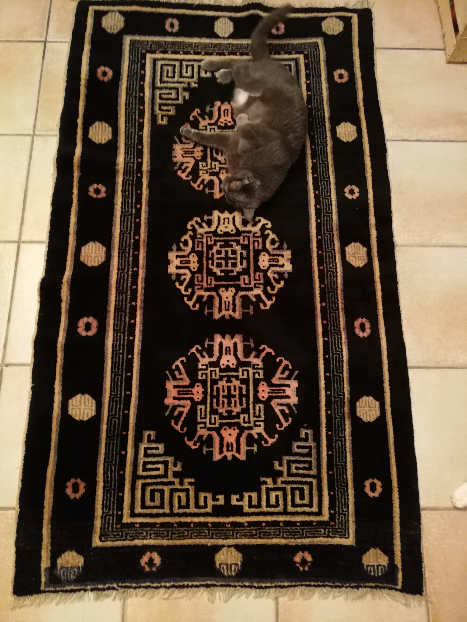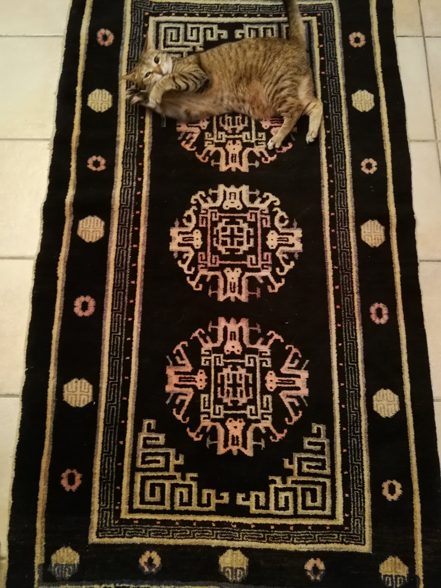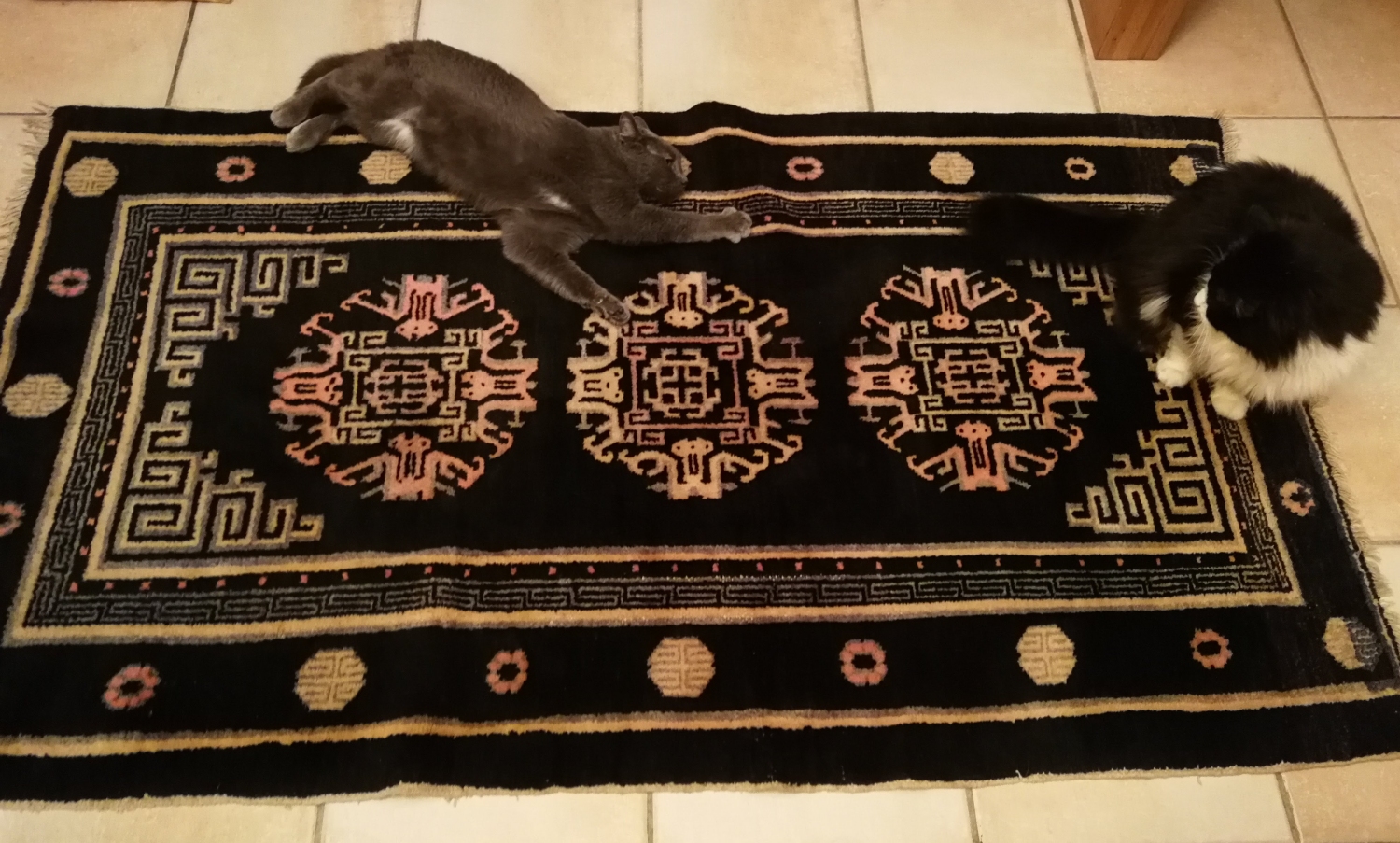 Voilà, comme Anna vous le disait, samedi dernier, j’ai acheté un tapis, un magnifique tapis, un bout de Tibet qui est devenu rapidement la totalité de l’espace de nos chats, un jardin qu’ils ne cessent d’explorer depuis… Ils sont vraiment adorables à le parcourir, à se prélasser dessus, à le faire « sien »…