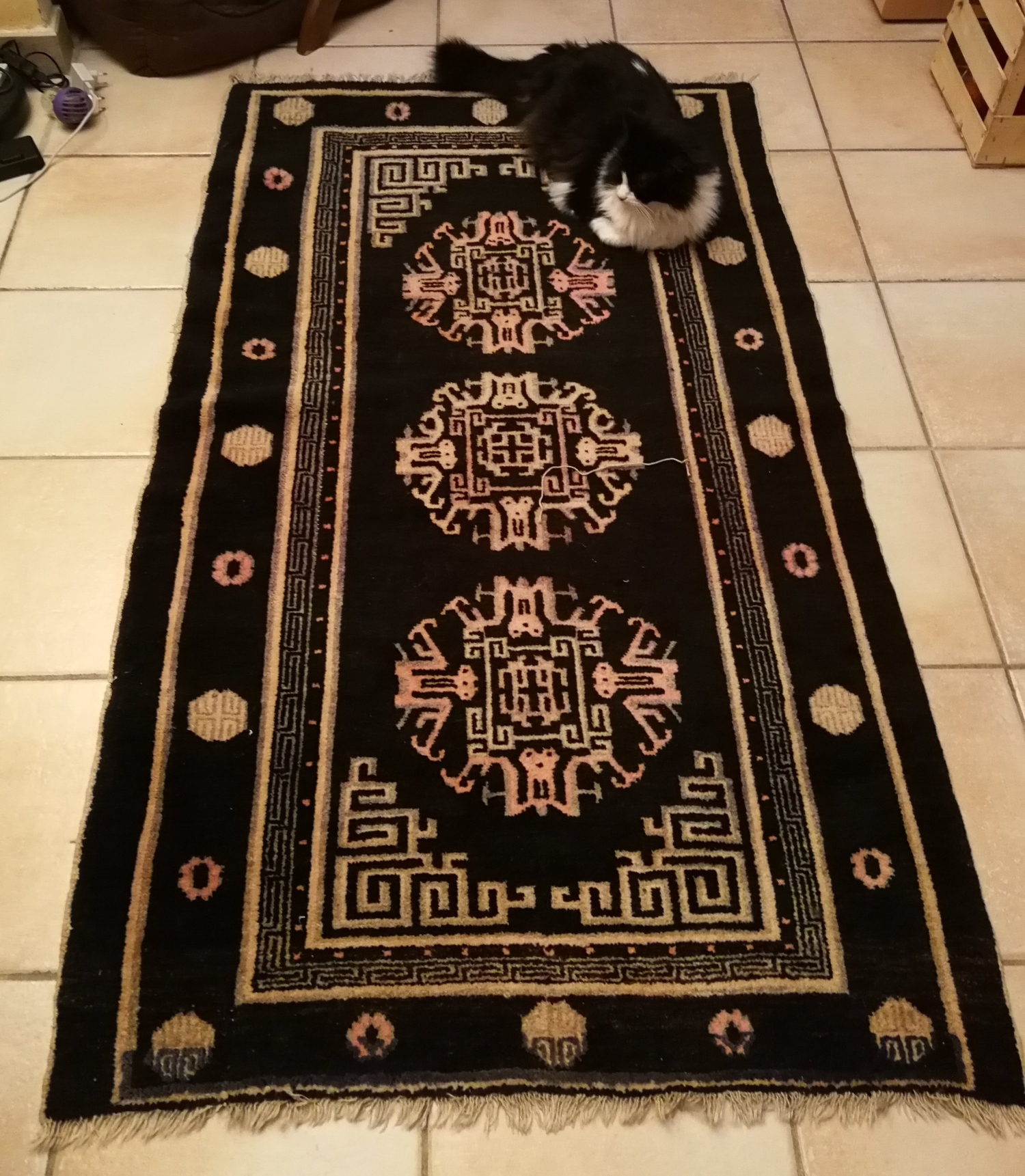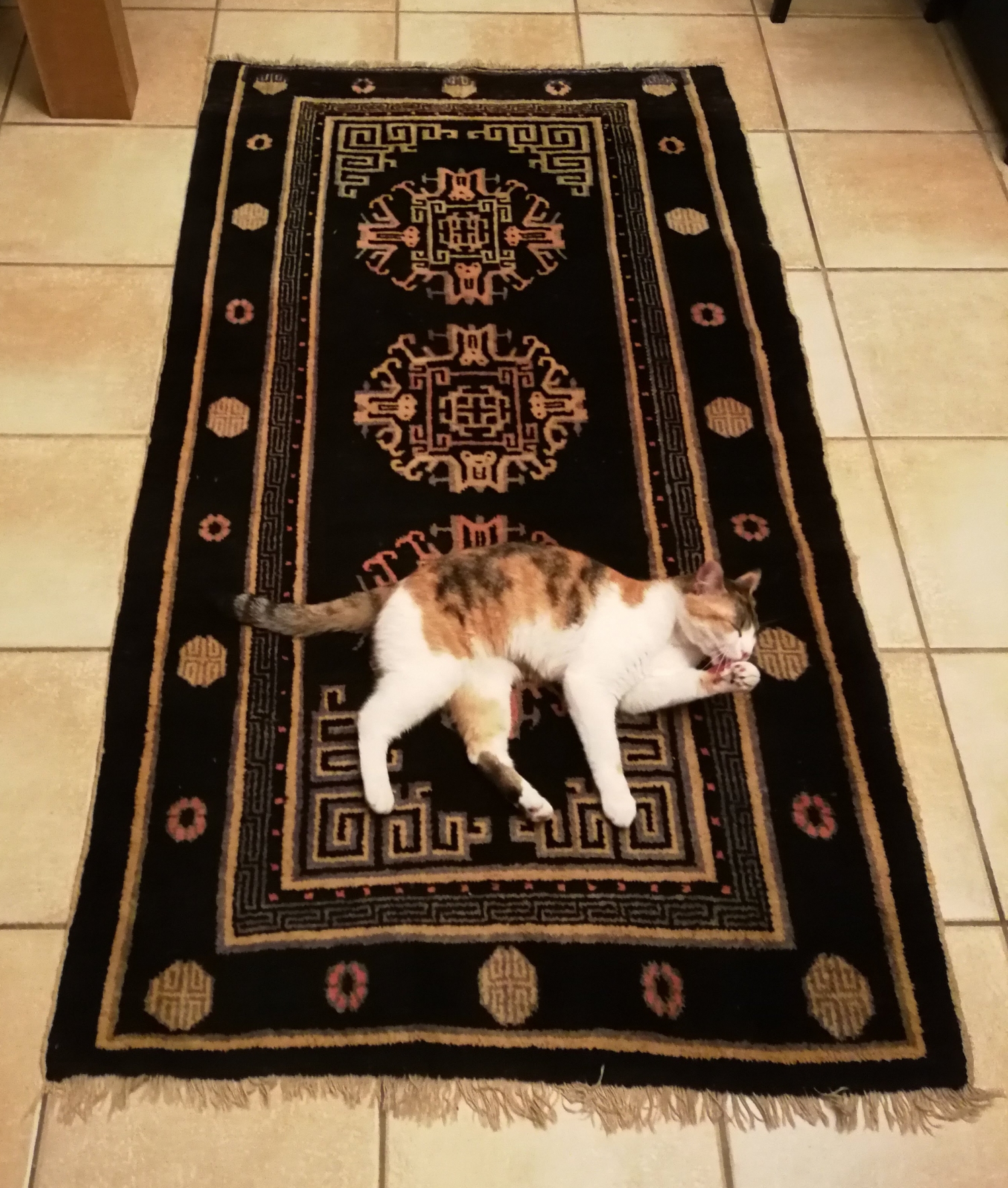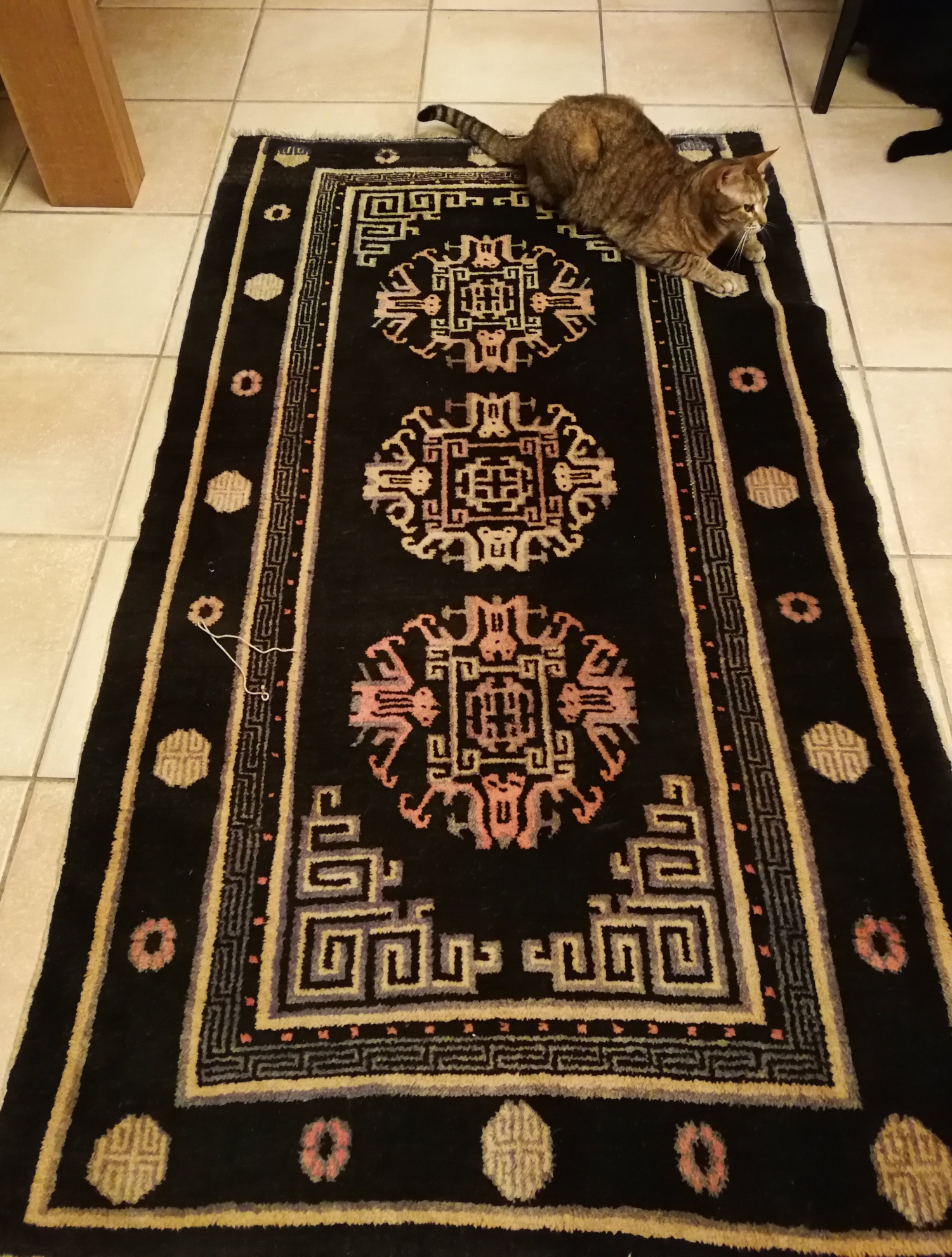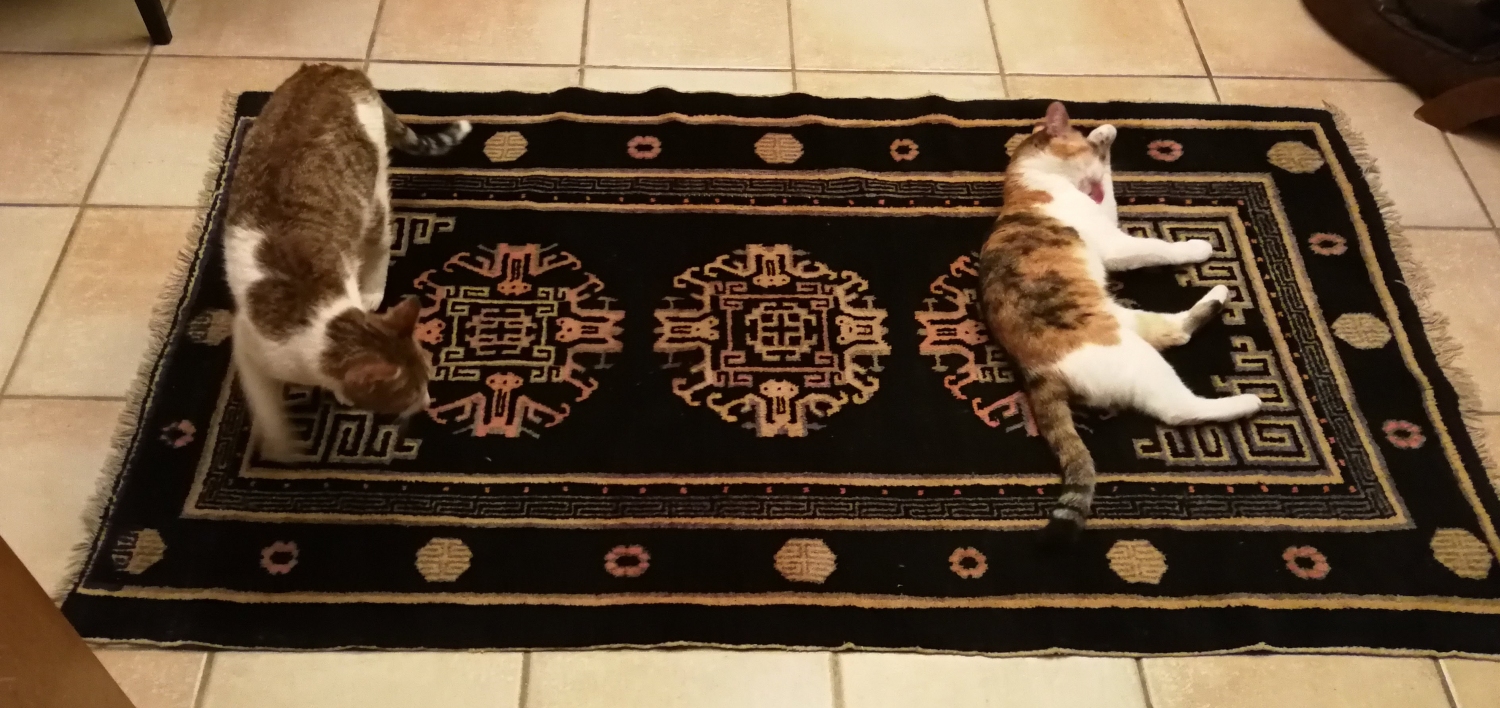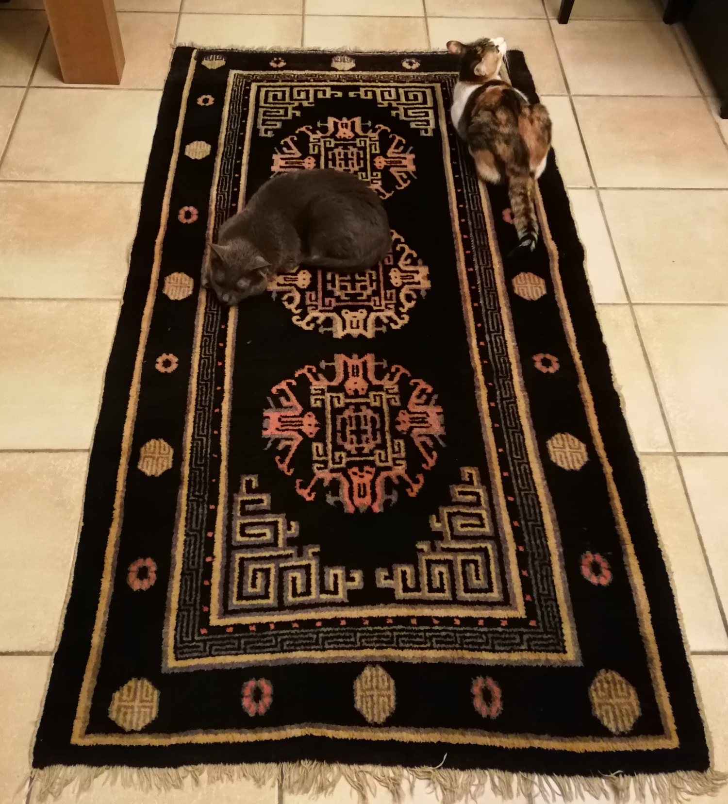 Voilà, comme Anna vous le disait, samedi dernier, j’ai acheté un tapis, un magnifique tapis, un bout de Tibet qui est devenu rapidement la totalité de l’espace de nos chats, un jardin qu’ils ne cessent d’explorer depuis… Ils sont vraiment adorables à le parcourir, à se prélasser dessus, à le faire « sien »…