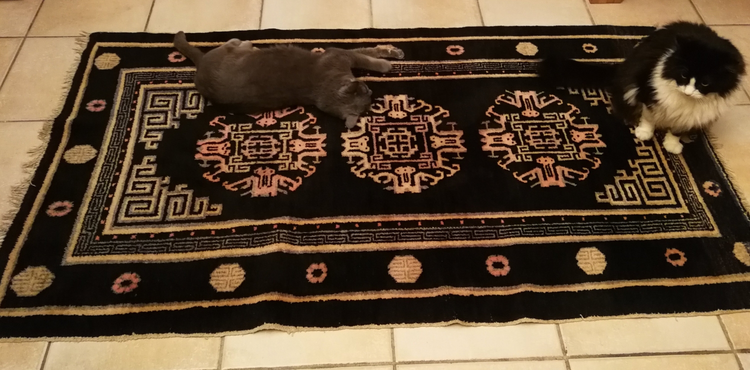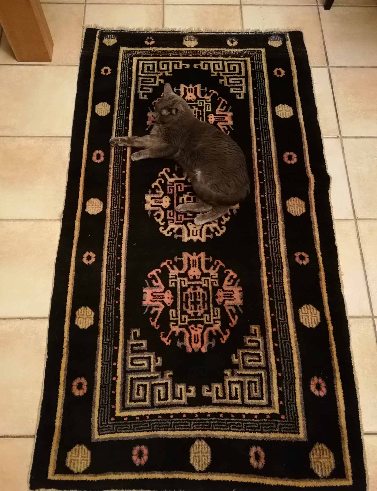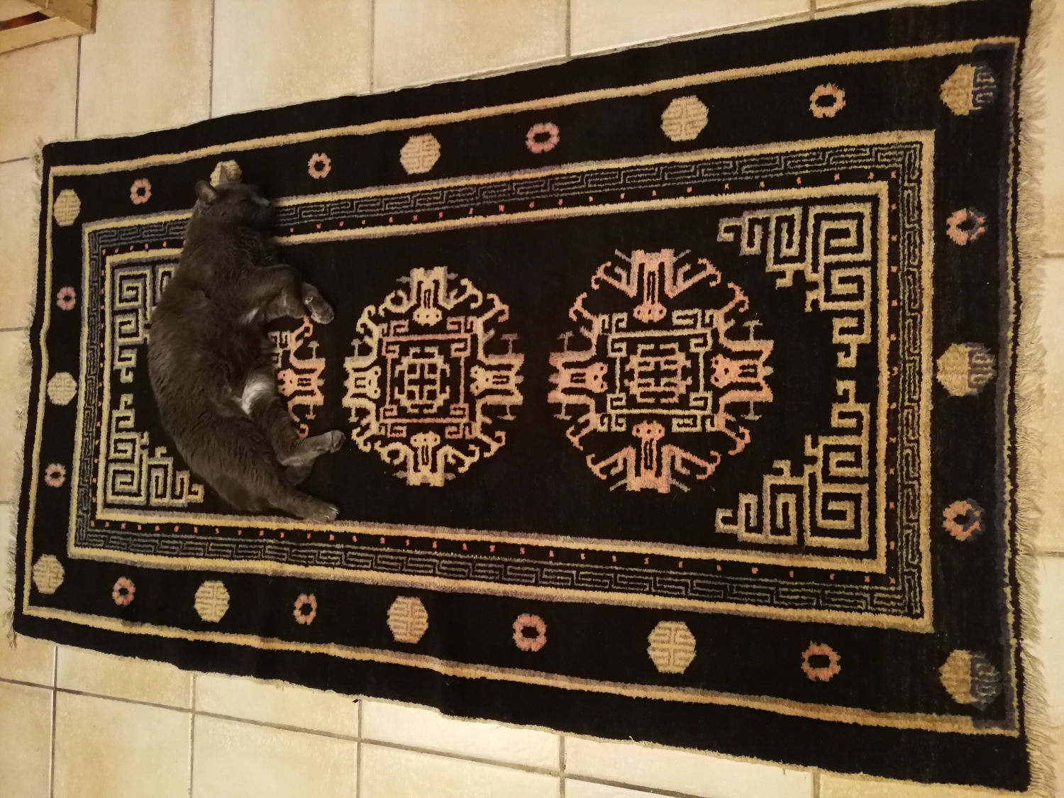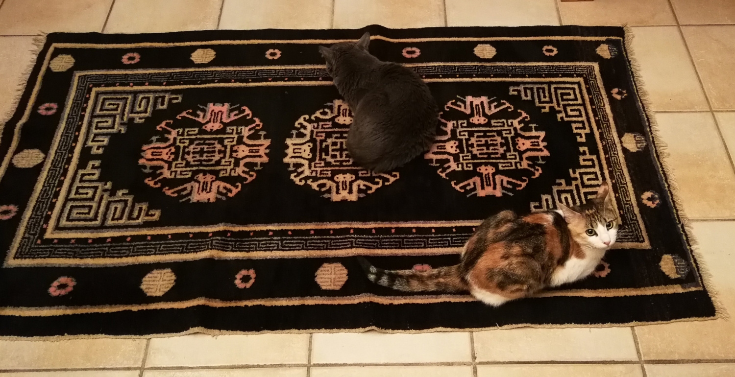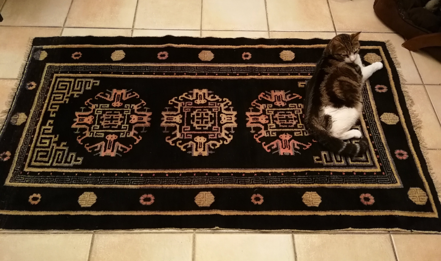 Voilà, comme Anna vous le disait, samedi dernier, j’ai acheté un tapis, un magnifique tapis, un bout de Tibet qui est devenu rapidement la totalité de l’espace de nos chats, un jardin qu’ils ne cessent d’explorer depuis… Ils sont vraiment adorables à le parcourir, à se prélasser dessus, à le faire « sien »…
