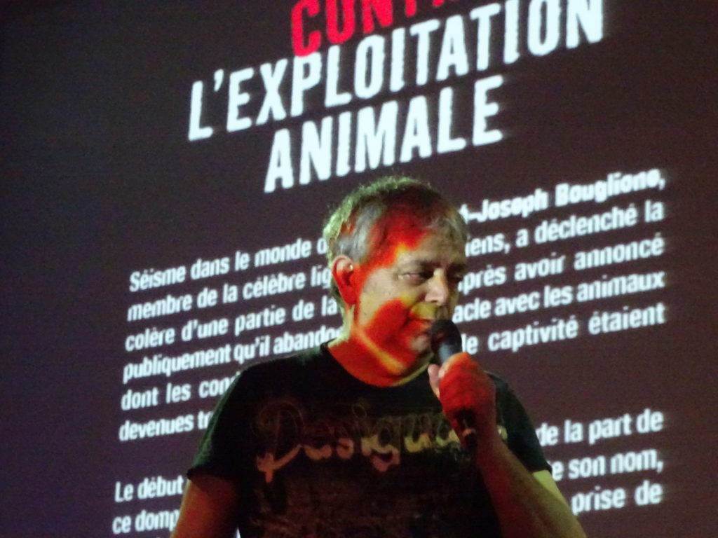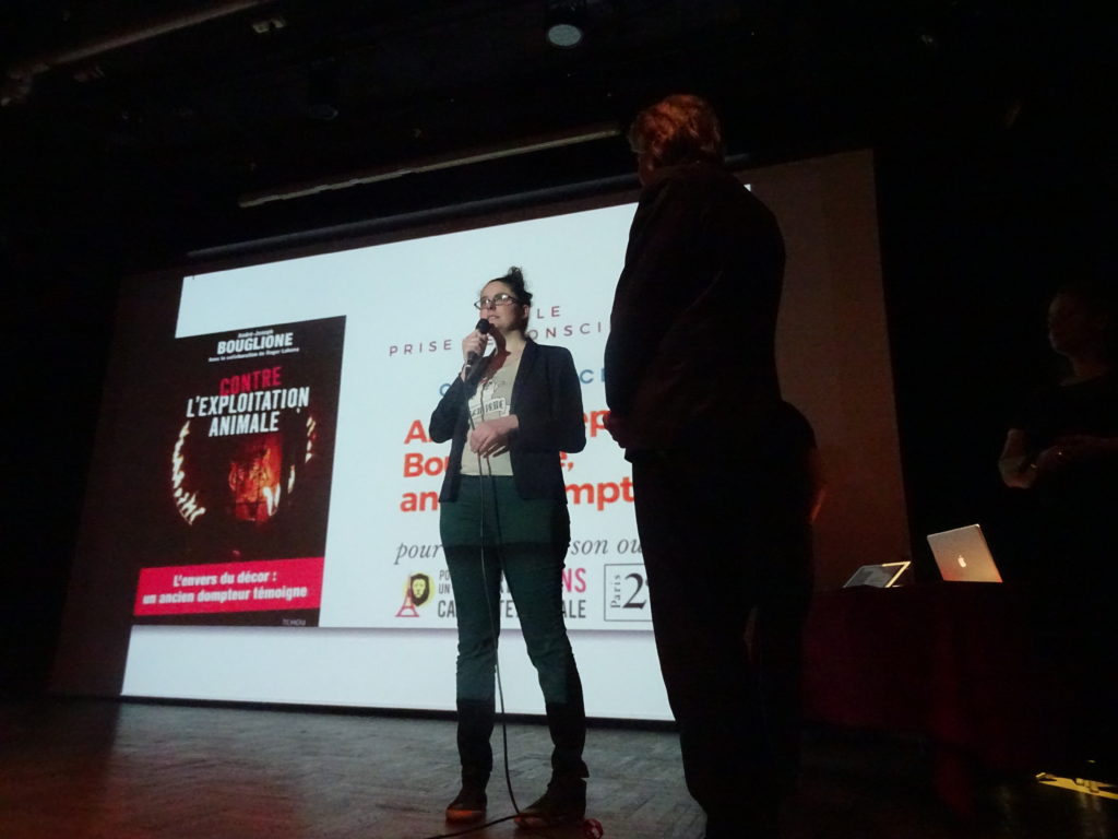 Hier, c’était le lancement à Paris de la sortie du livre « Contre l’exploitation animale » que j’ai écrit avec André-Joseph Bouglione et qui est sorti le 5 avril. Nous étions dans la magnifique salle du centre Jean Dame, avec un public intégralement composé de militants animalistes. Jacques Boutault, maire du 2e arrondissement et fervent soutien de la cause animale, a ouvert la soirée, puis Amandine Sanvisens de Paris Animaux Zoopolis, organisatrice de l’événement.