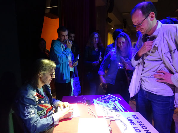 Est venu le moment de dédicacer les exemplaires achetés par celles et ceux qui le voulaient et là, très euphorisant, on s’est retrouvés avec des gens qui faisaient la queue depuis la salle jusqu’à la petite table où André et moi étions installés pour signer. Nous avons eu à cette occasion de nombreux échanges avec les personnes qui venaient nous voir.