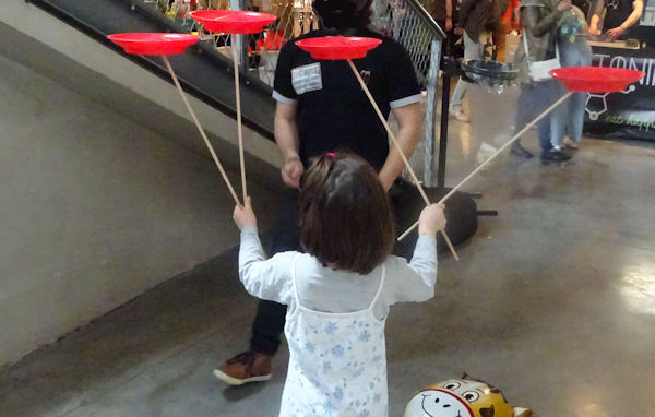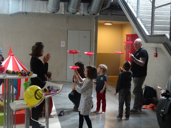Un jongleur professionnel est intervenu à plusieurs reprises dans la journée pour animer les abords du stand en proposant aux enfants – de tous les âges – les bases du jonglage avec balles, cerceaux, assiettes, etc. Pour l’accompagner, Sandrine a préparé de la barbe à papa.