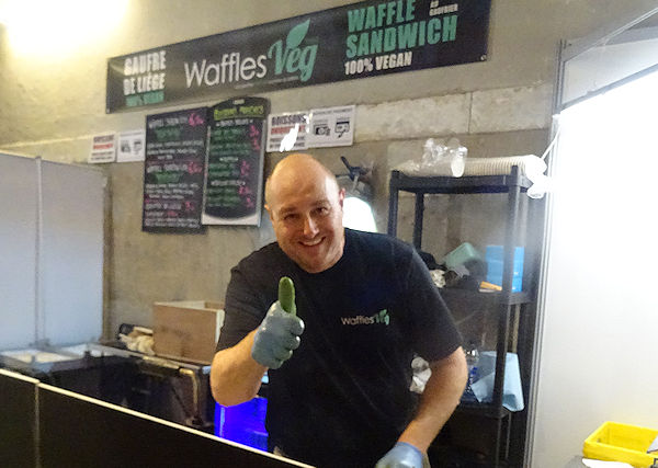 Un petit coup d’oeil à un grand ami, Jérôme Lescure, réalisateur du génialissime film ALF (Animal Liberation Front) qui s’est reconverti dans les gaufres vegans. Son stand n’a pas désempli de la journée, avec parfois des dizaines de personnes qui faisaient la queue.
