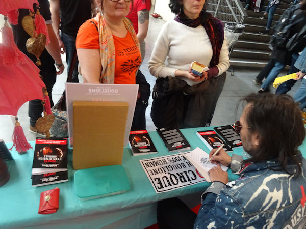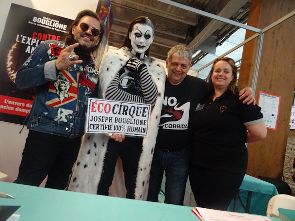 Notre stand a connu un beau succès, beaucoup de personnes souhaitant en savoir plus sur l’admirable évolution de Sandrine et André-Joseph vers un nouveau cirque traditionnel sans animaux, qui sera d’une conception révolutionnaire puisque imprégné dans tous ses détails d’écologie appliquée. Et, bien sûr, plusieurs journalistes sont passés pour interviewer André-Joseph.
