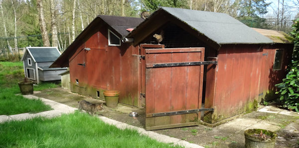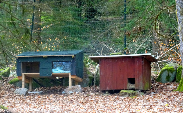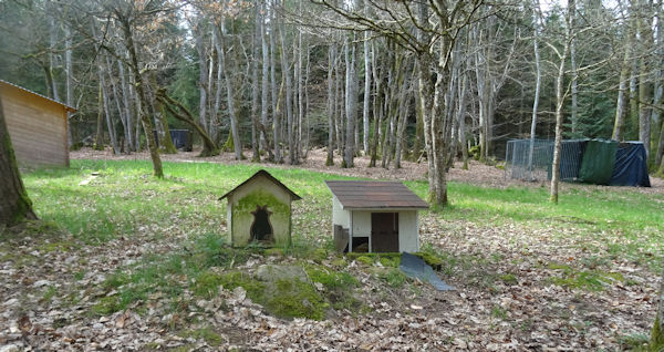 Sur la droite au fond, une grande cage qui a abrité des renardeaux recueillis jusqu’à ce qu’ils soient en mesure de reprendre leur liberté dans les bois environnants.