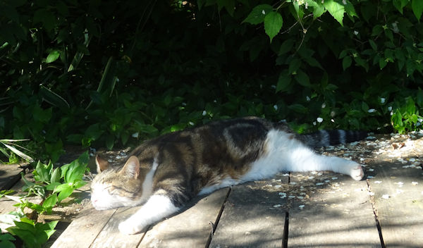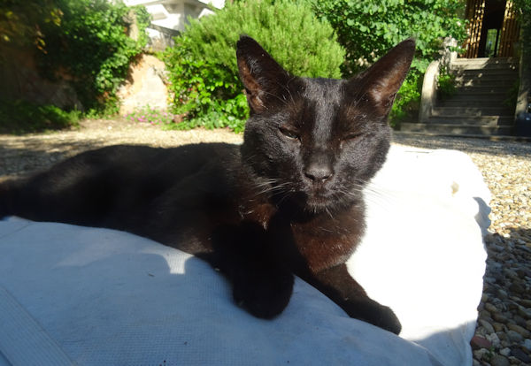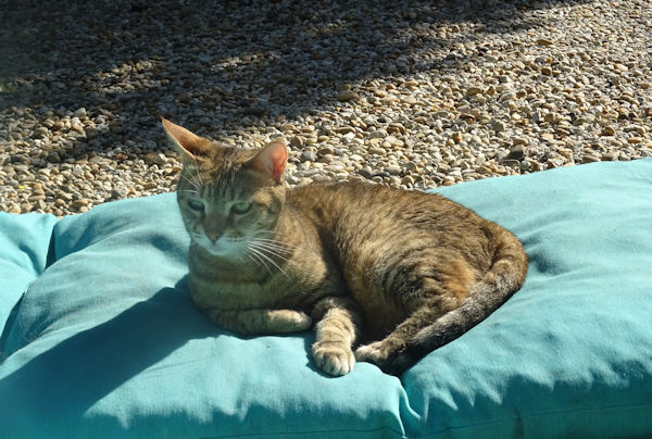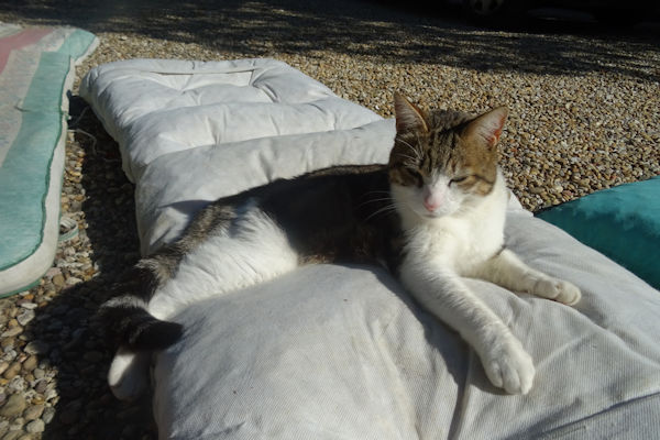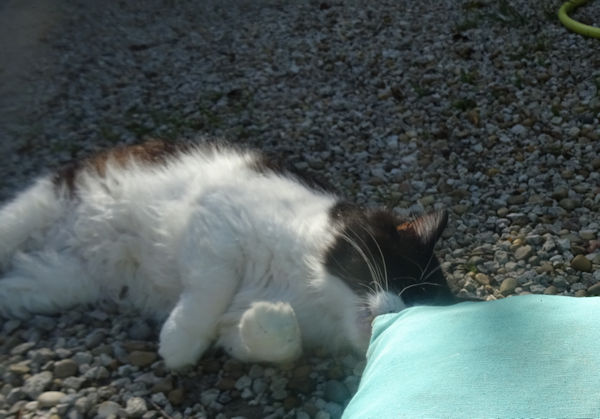 … Mimi, qui a conservé une préférence pour le gravier, où il s’est roulé dans tous les sens en ronronnant comme un bienheureux qu’il est…
