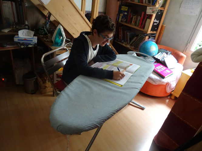 Hier, dans la matinée, Enzo avait des devoirs à faire. Son bureau étant un petit peu encombré, Anti lui a trouvé une autre solution, bien plus simple que de le ranger. C’est ce qu’on appelle repasser ses leçons.