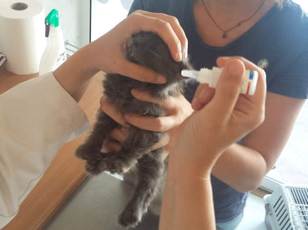 La véto a validé en tous points ce qu’Anti avait commencé comme traitement. A un détail près : cette petite boule de poil a doublé de poids en une dizaine de jours. Il est passé de 365 g à 750. Du coup, les doses qu’Anti lui administrait étaient trop faibles pour être actives. Cela devrait être bien plus efficace maintenant.